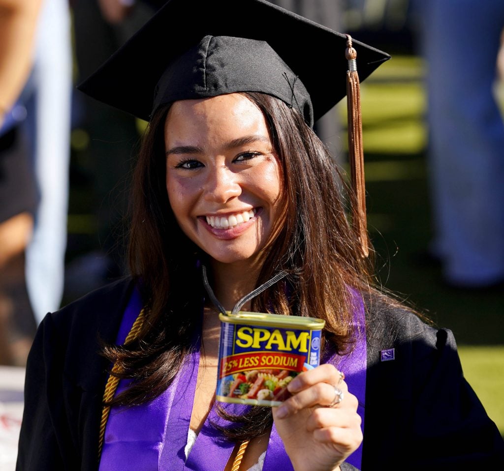 A graduate shows off her can of Spam ornament necklace (Spam is an island favorite) during Friday morning’s winter commencement ceremony on Dec. 12, 2025. -