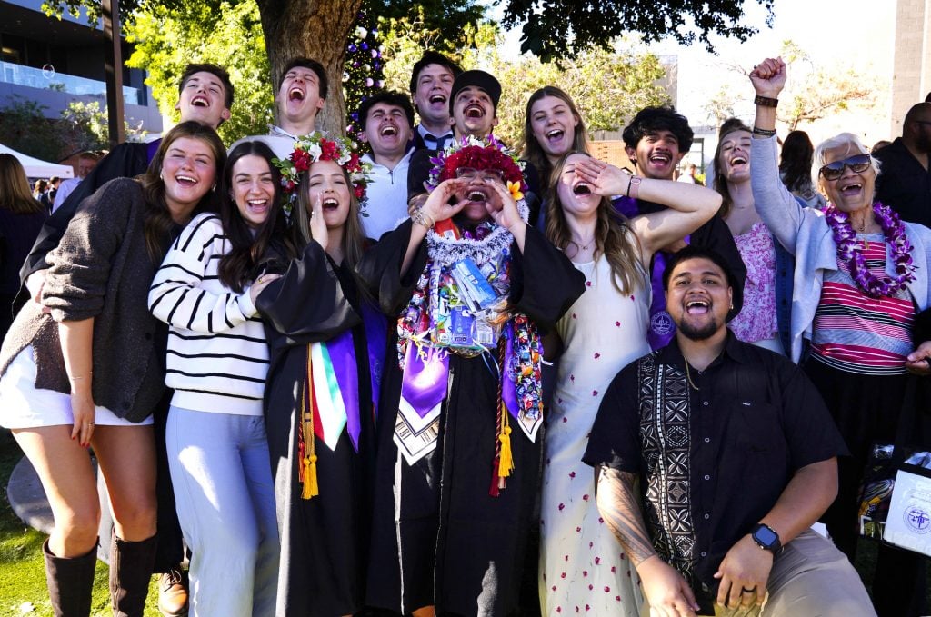 Graduates take photos with family members during Friday morning’s winter commencement ceremony on Dec. 12, 2025. -
