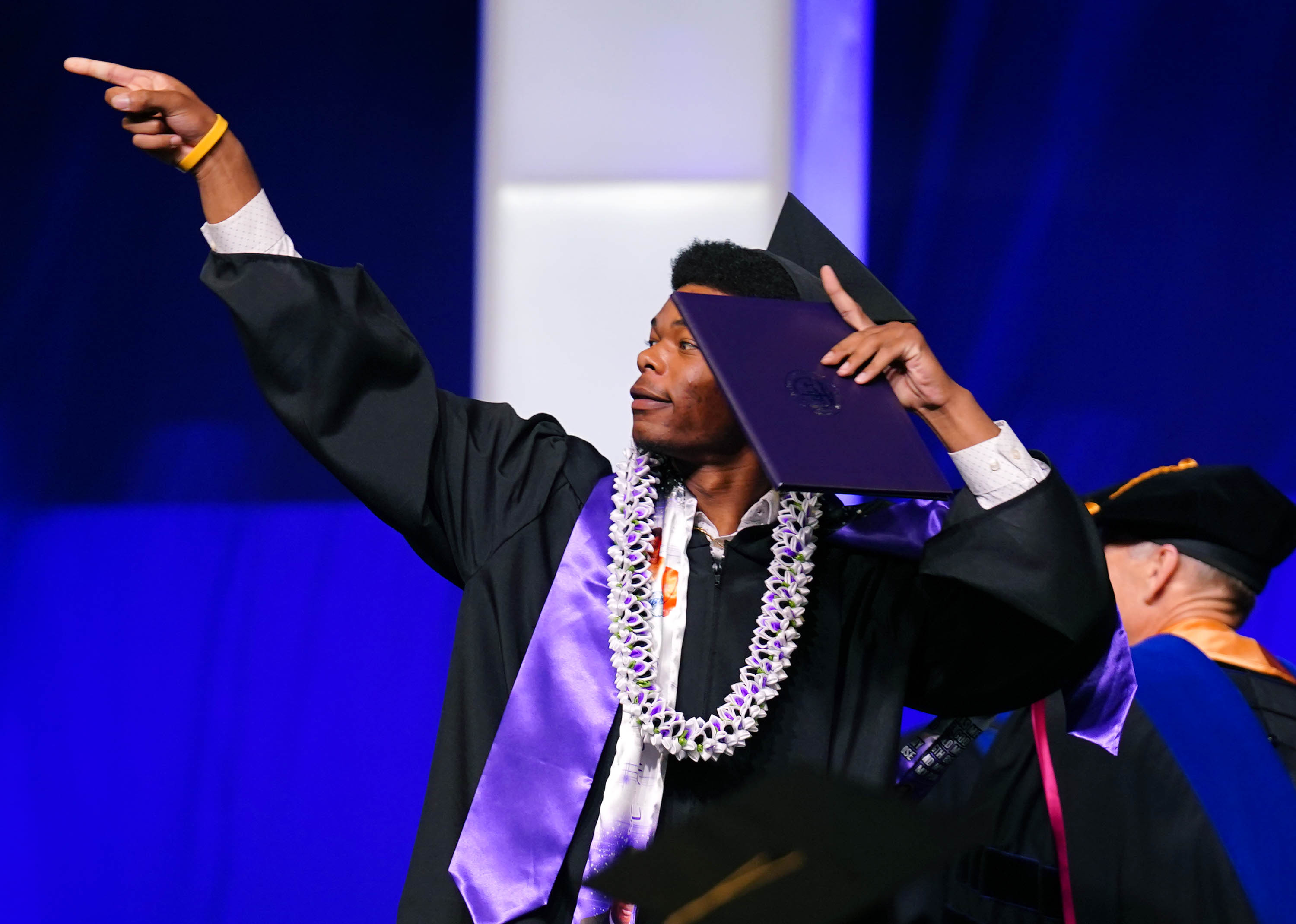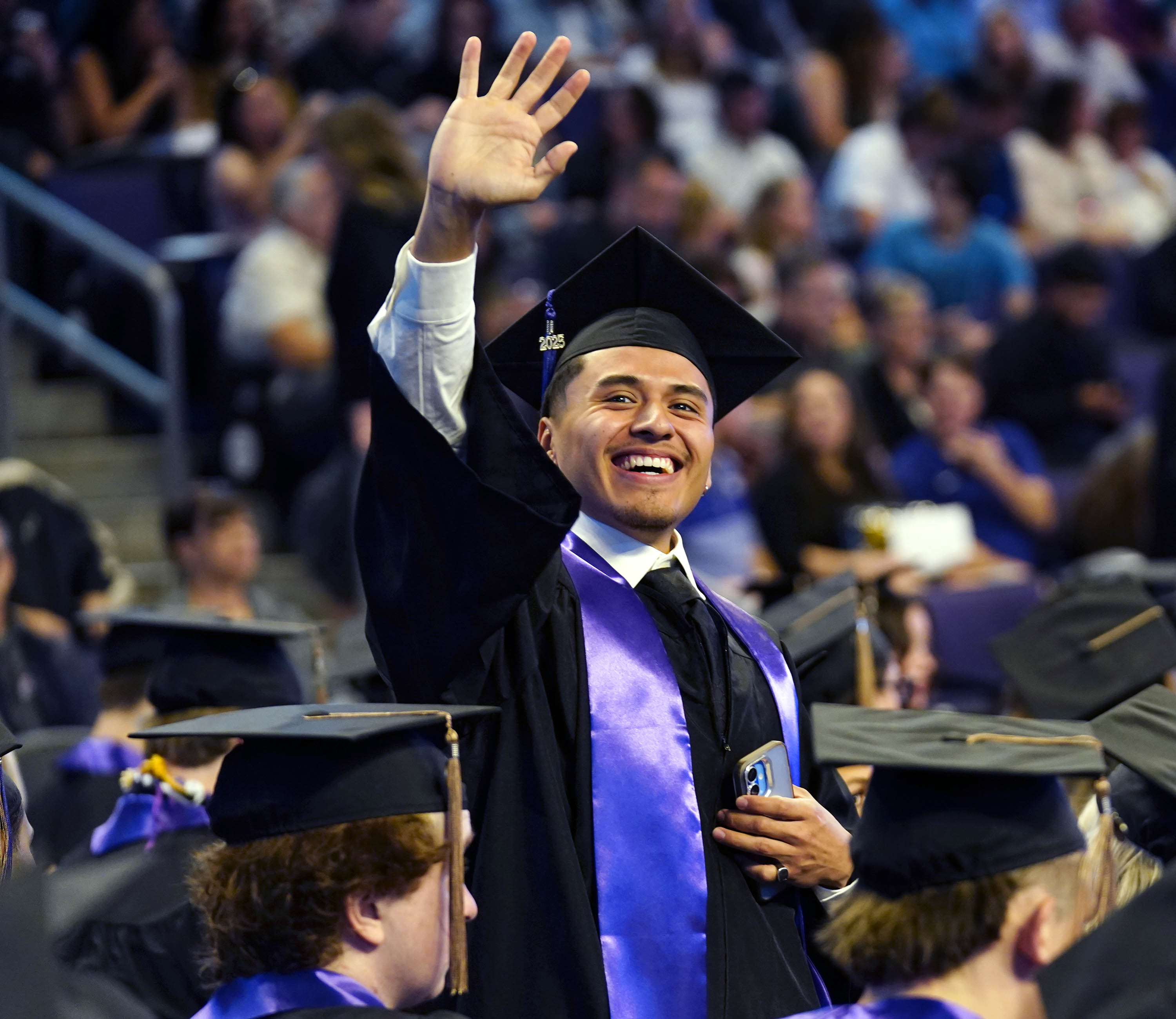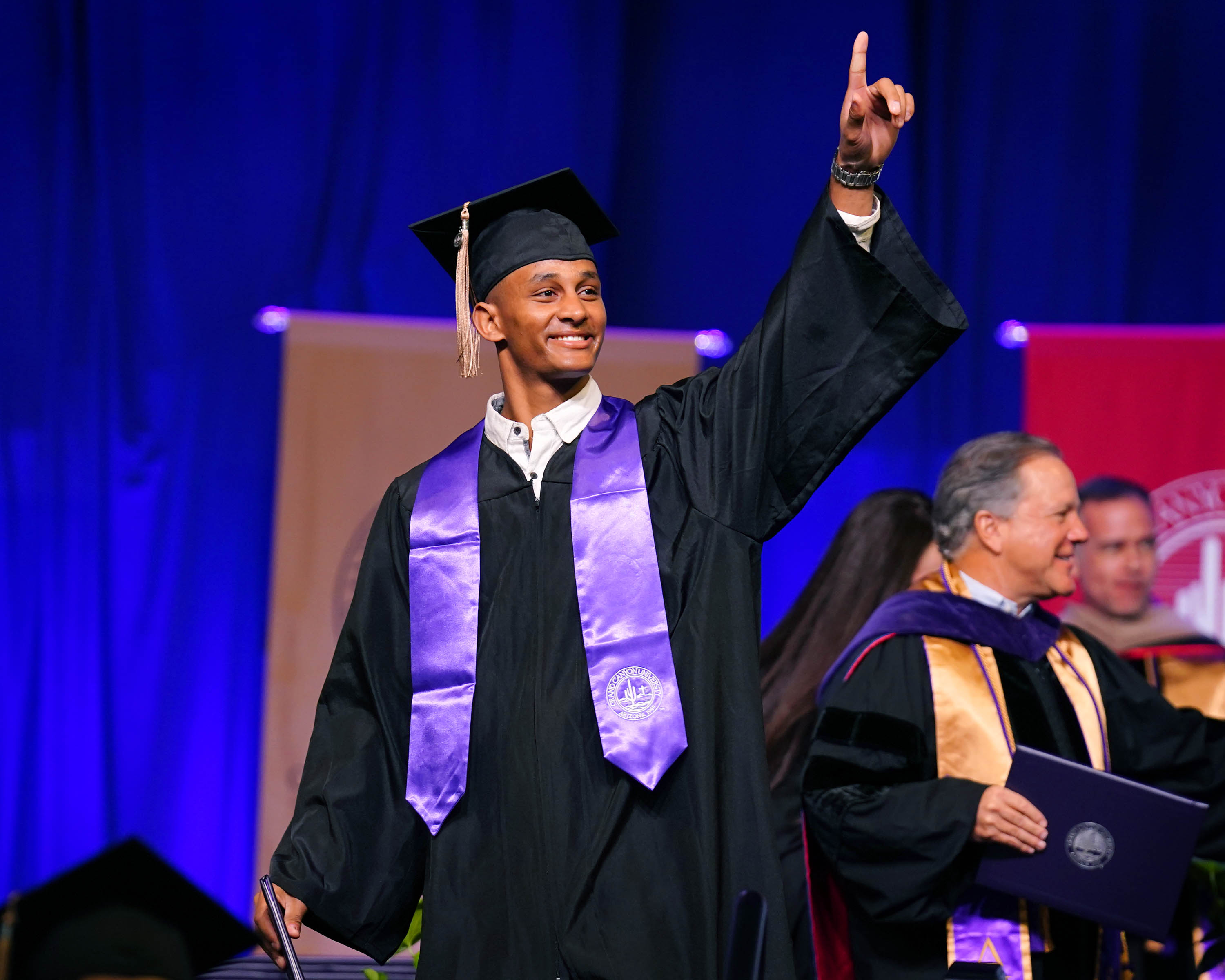 A graduate acknowledges family after receiving his diploma during Friday morning’s winter commencement ceremony on Dec. 12, 2025. -