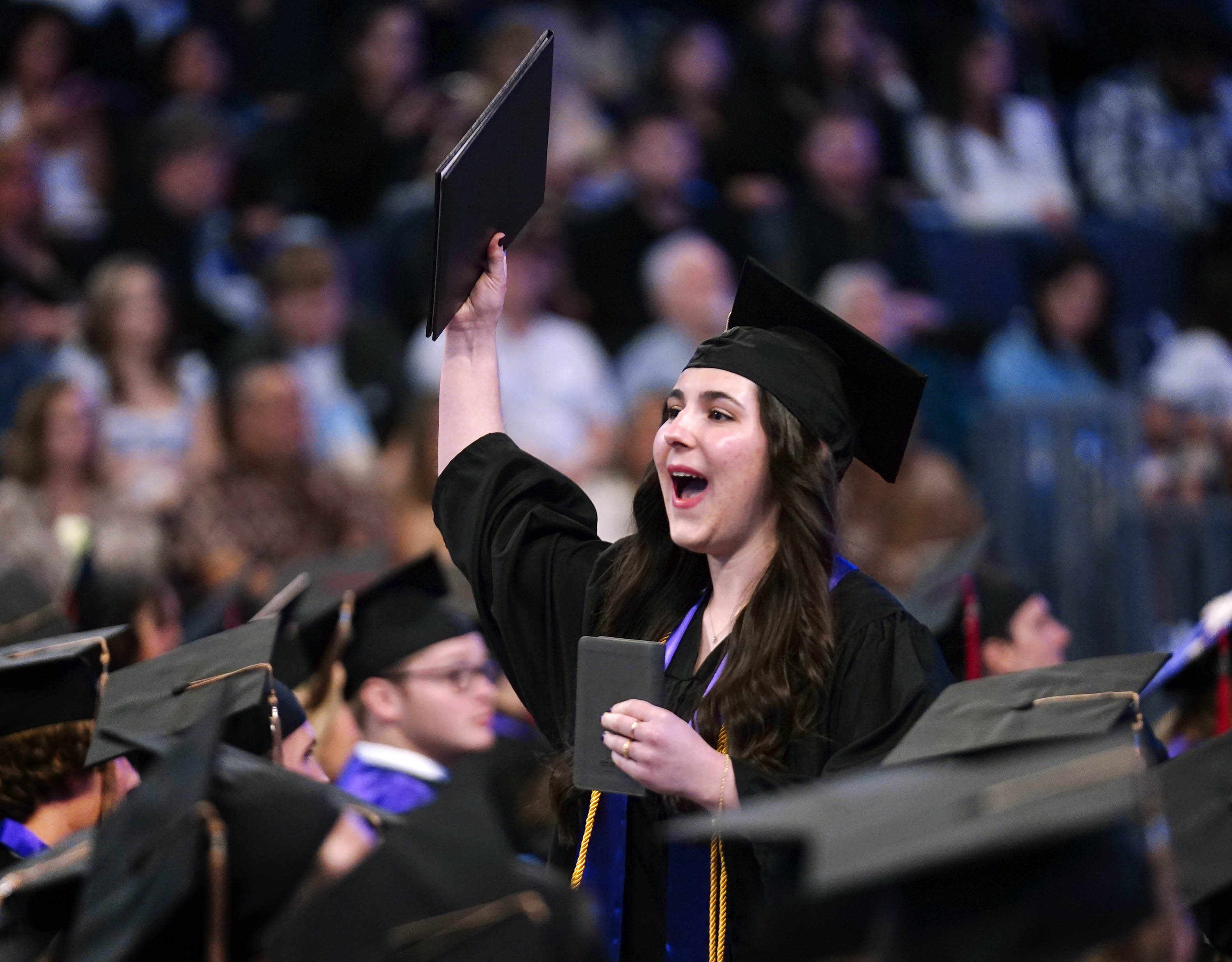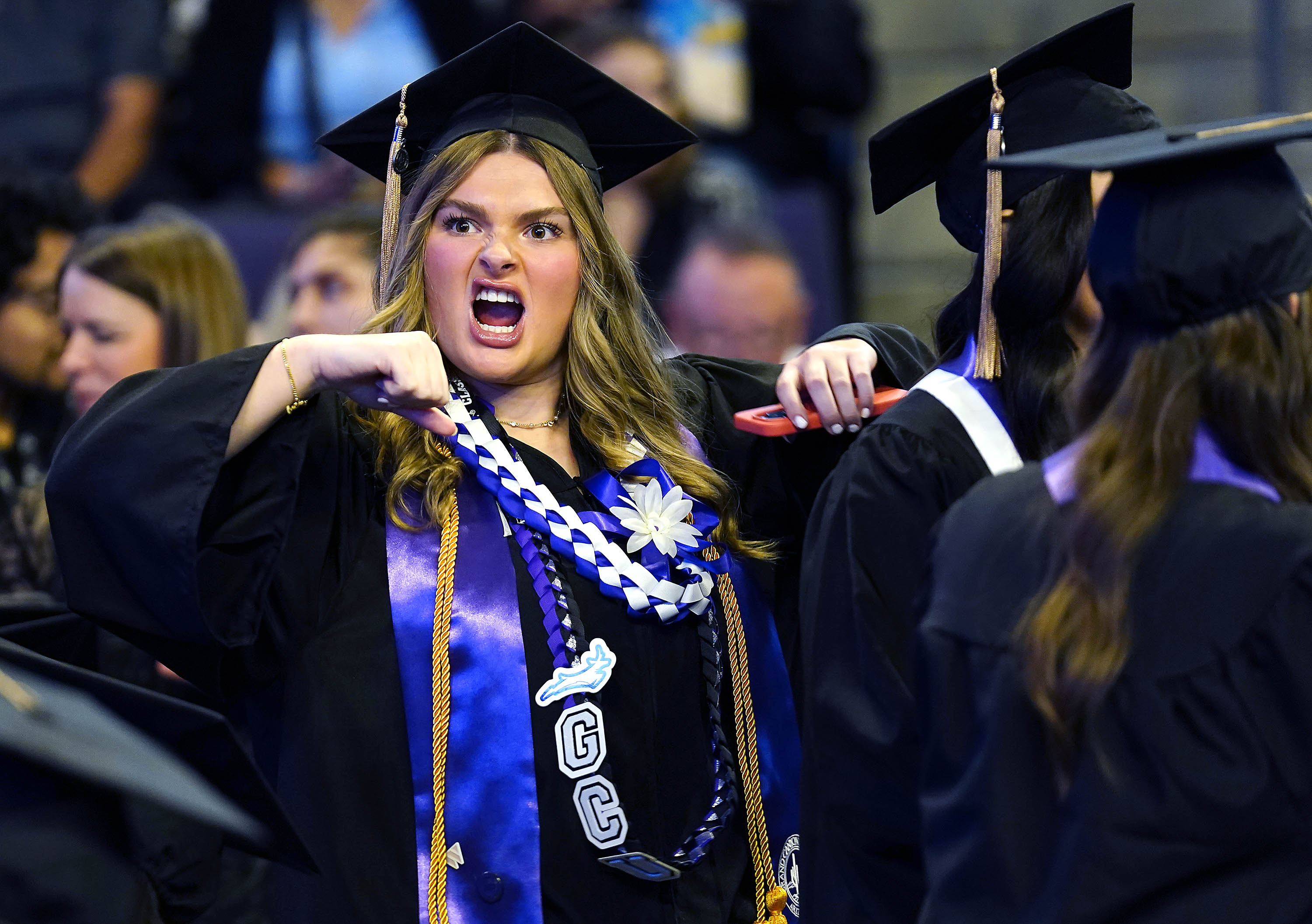 A graduate celebrates after receiving her diploma during Friday morning’s winter commencement ceremony at Global Credit Union Arena on Dec. 12, 2025. -