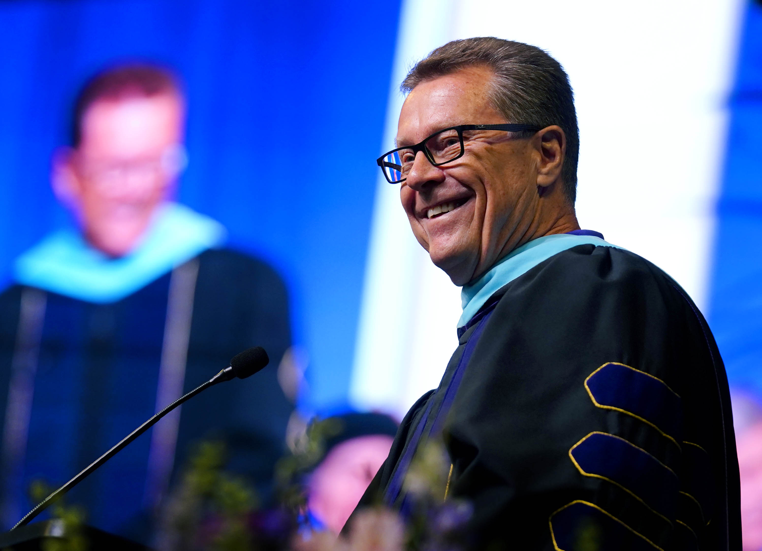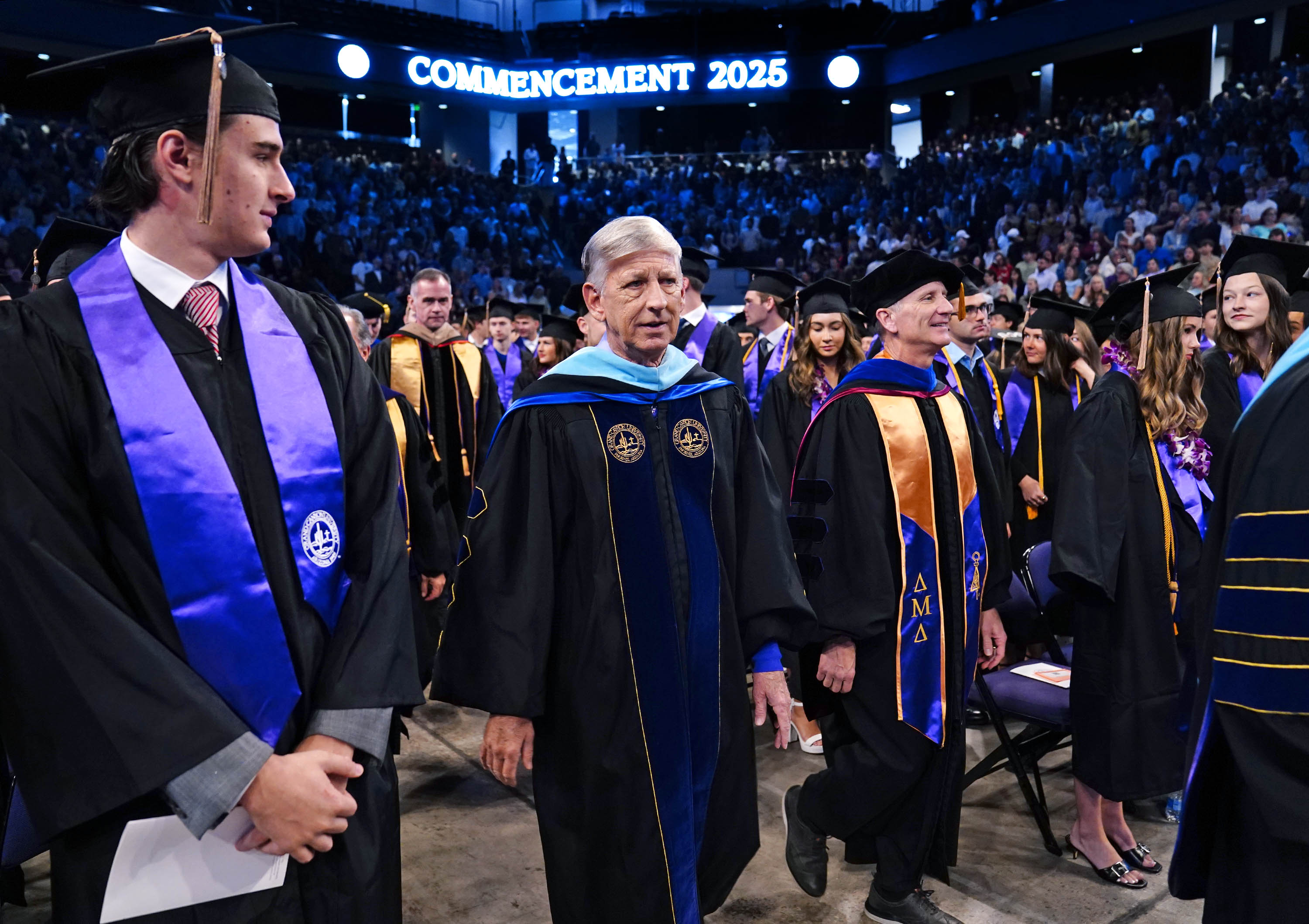 GCU President Brian Mueller and the processional make their way to the stage during Friday morning’s winter commencement ceremony at Global Credit Union Arena on Dec. 12, 2025. -