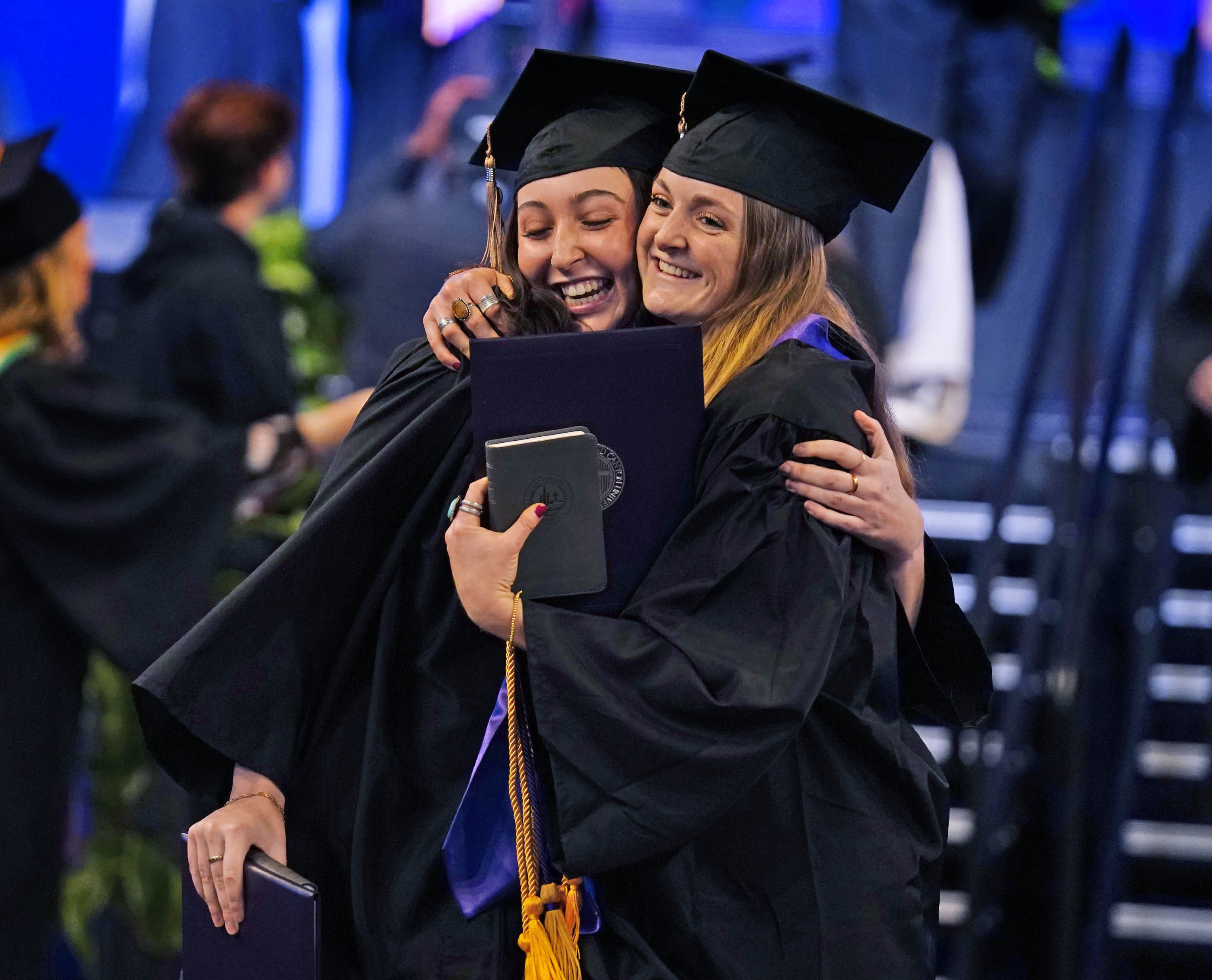 Graduates hug in celebration after receiving their diplomas during Friday morning’s winter commencement ceremony on Dec. 12, 2025. -