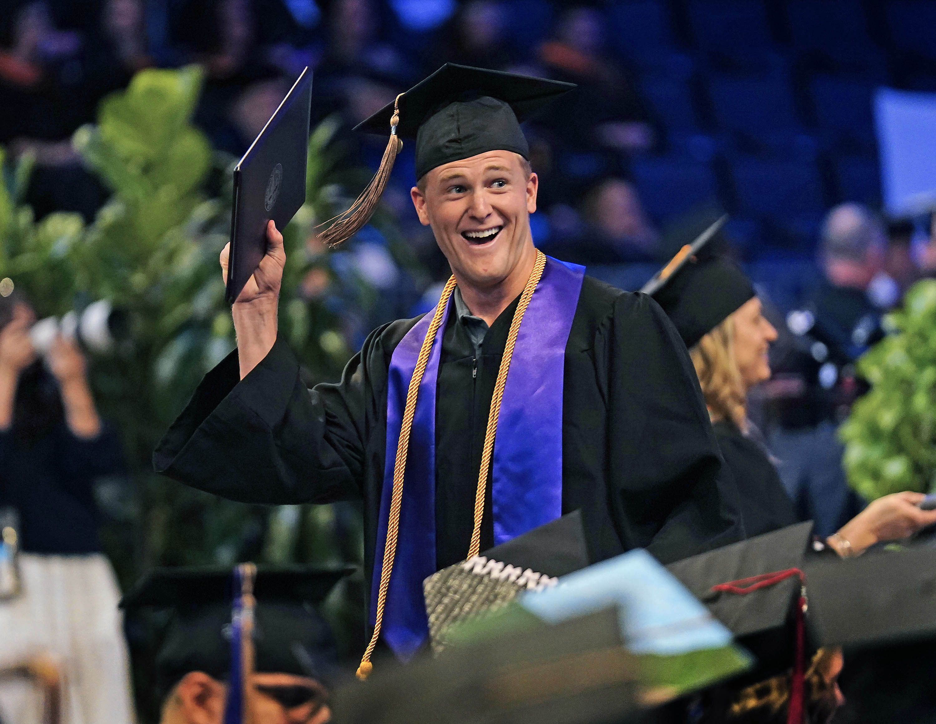 A graduate looks to family and friends in the crowd after receiving his diploma during Friday morning’s winter commencement ceremony on Dec. 12, 2025. -