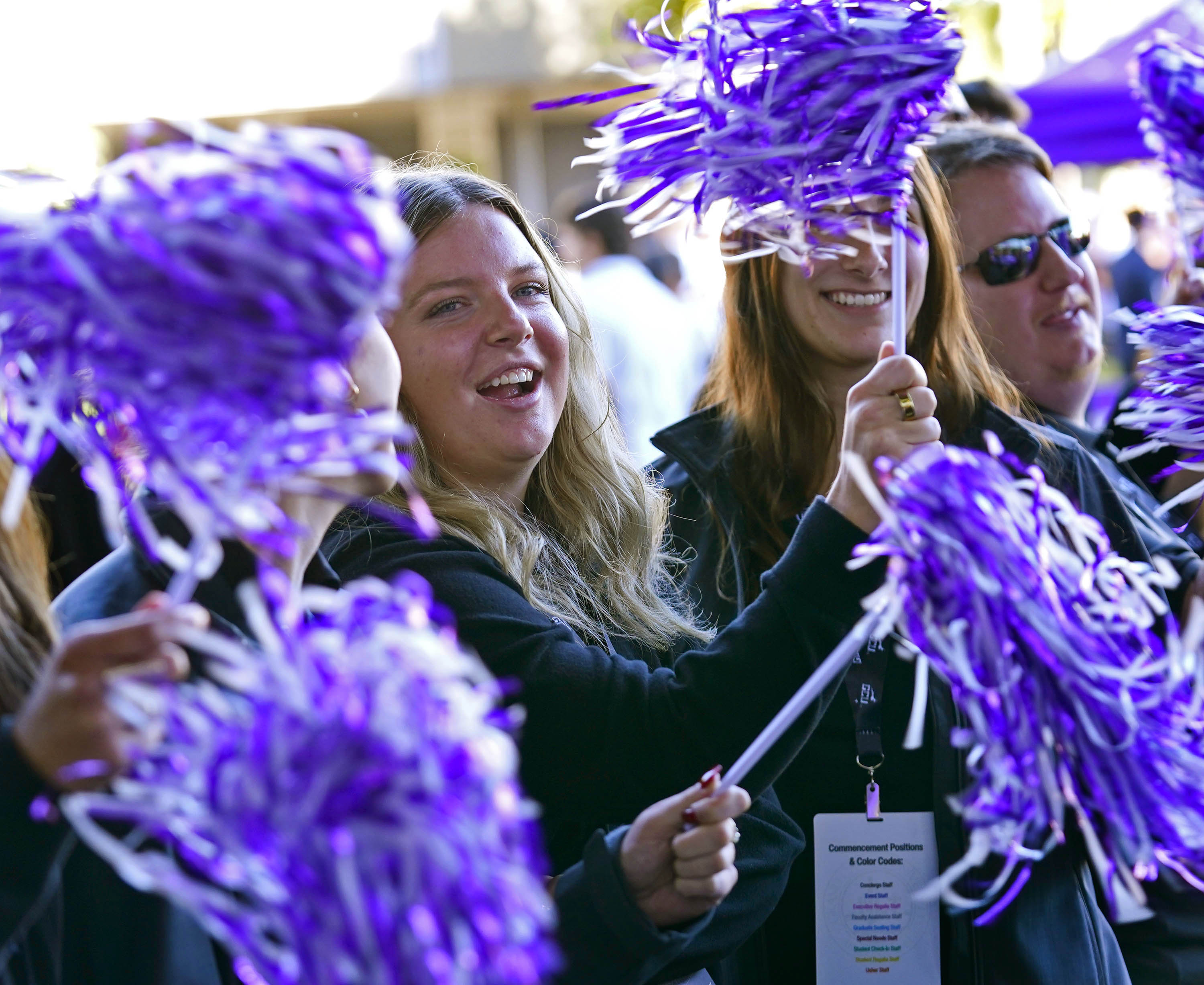 Commencement staff cheer on graduates as they exit the arena during Friday morning’s winter commencement ceremony at Global Credit Union Arena on Dec. 12, 2025. -