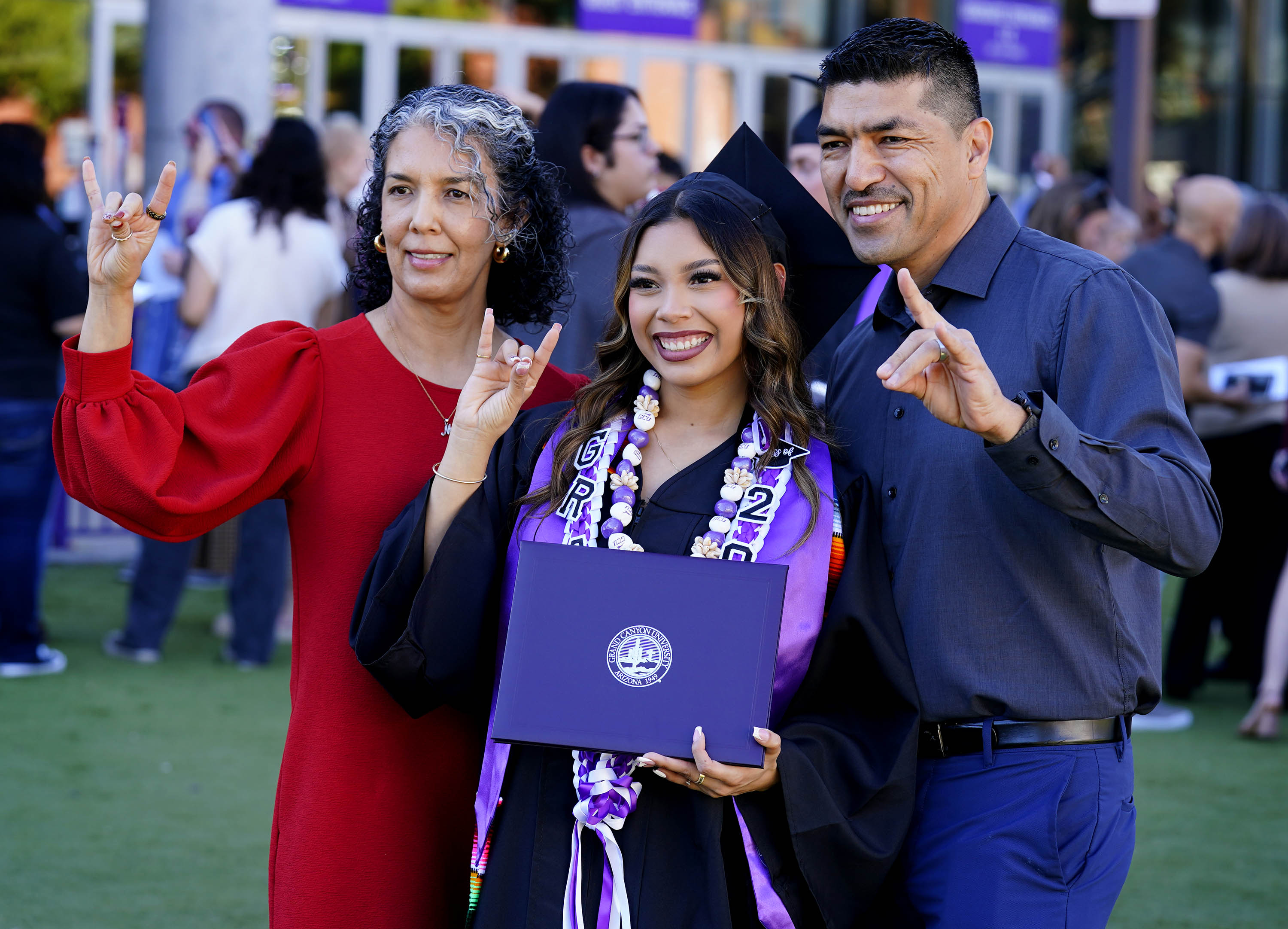 Graduates take photos with family members during Friday morning’s winter commencement ceremony at Global Credit Union Arena on Dec. 12, 2025. -