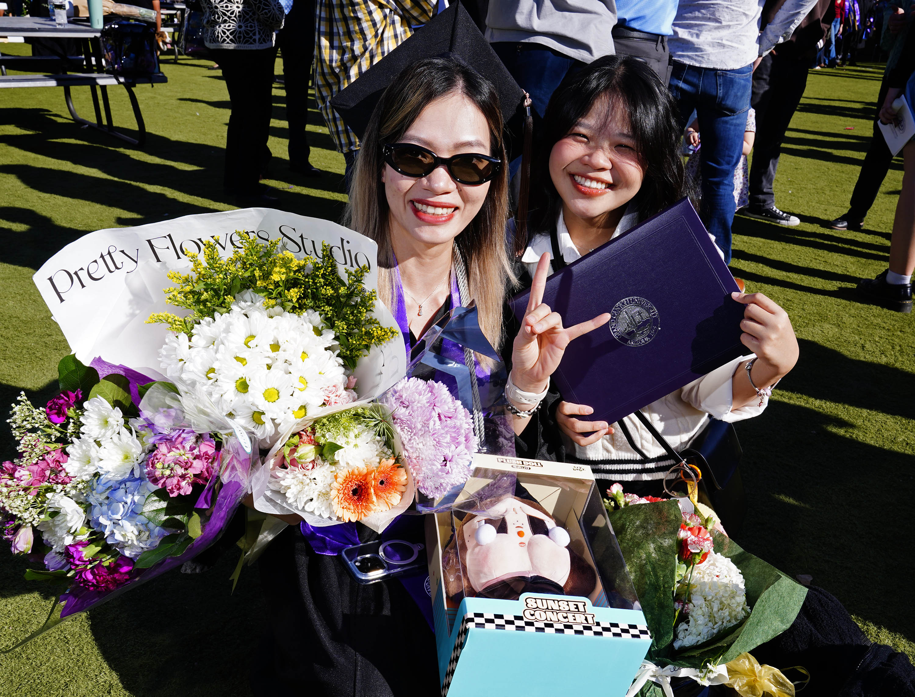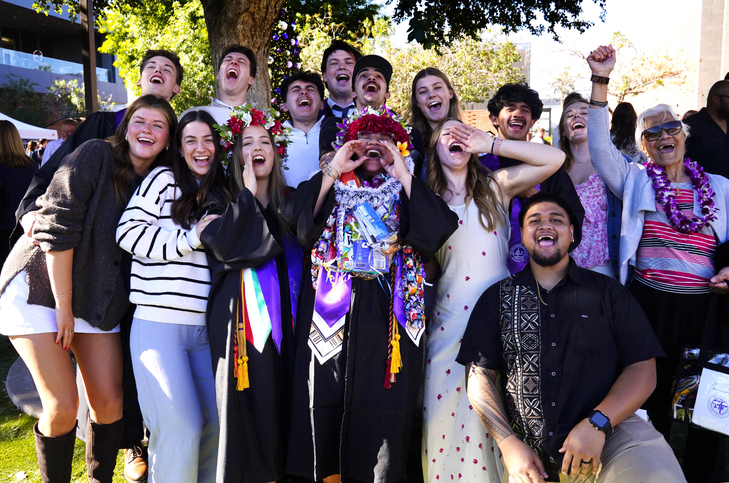 Graduates take photos with family members during Friday morning’s winter commencement ceremony on Dec. 12, 2025. -
