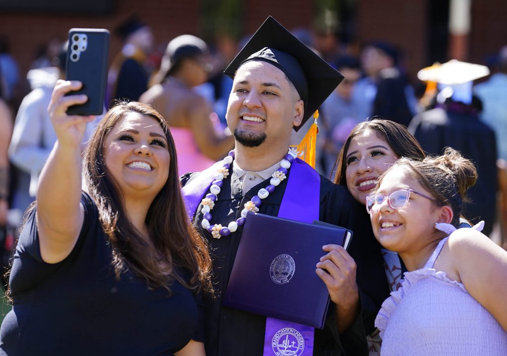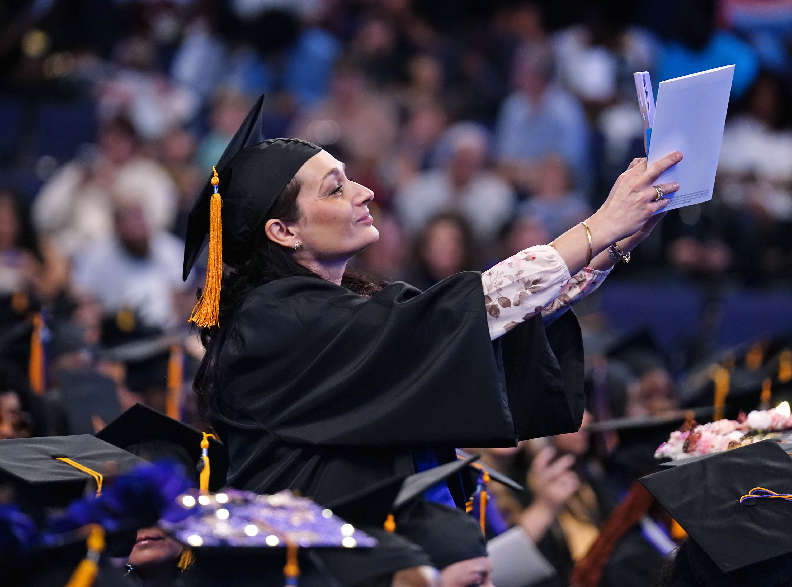 A graduate takes a selfie during the Thursday morning fall commencement ceremony at Global Credit Union Arena on Oct. 16, 2025. -