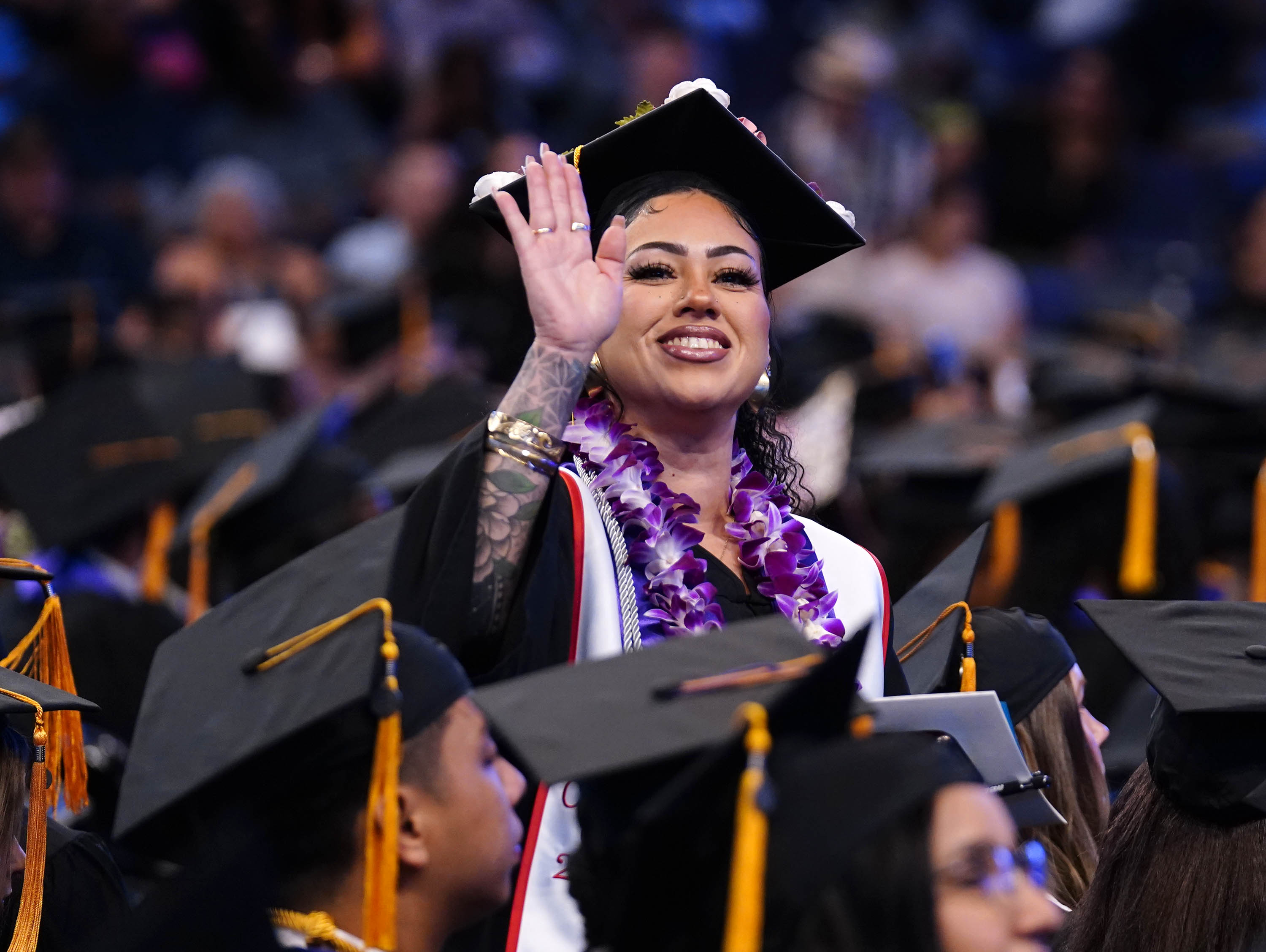 A graduate waves to family and friends during the Thursday morning commencement ceremony for online and cohort students at Global Credit Union Arena on Oct. 16, 2025. -