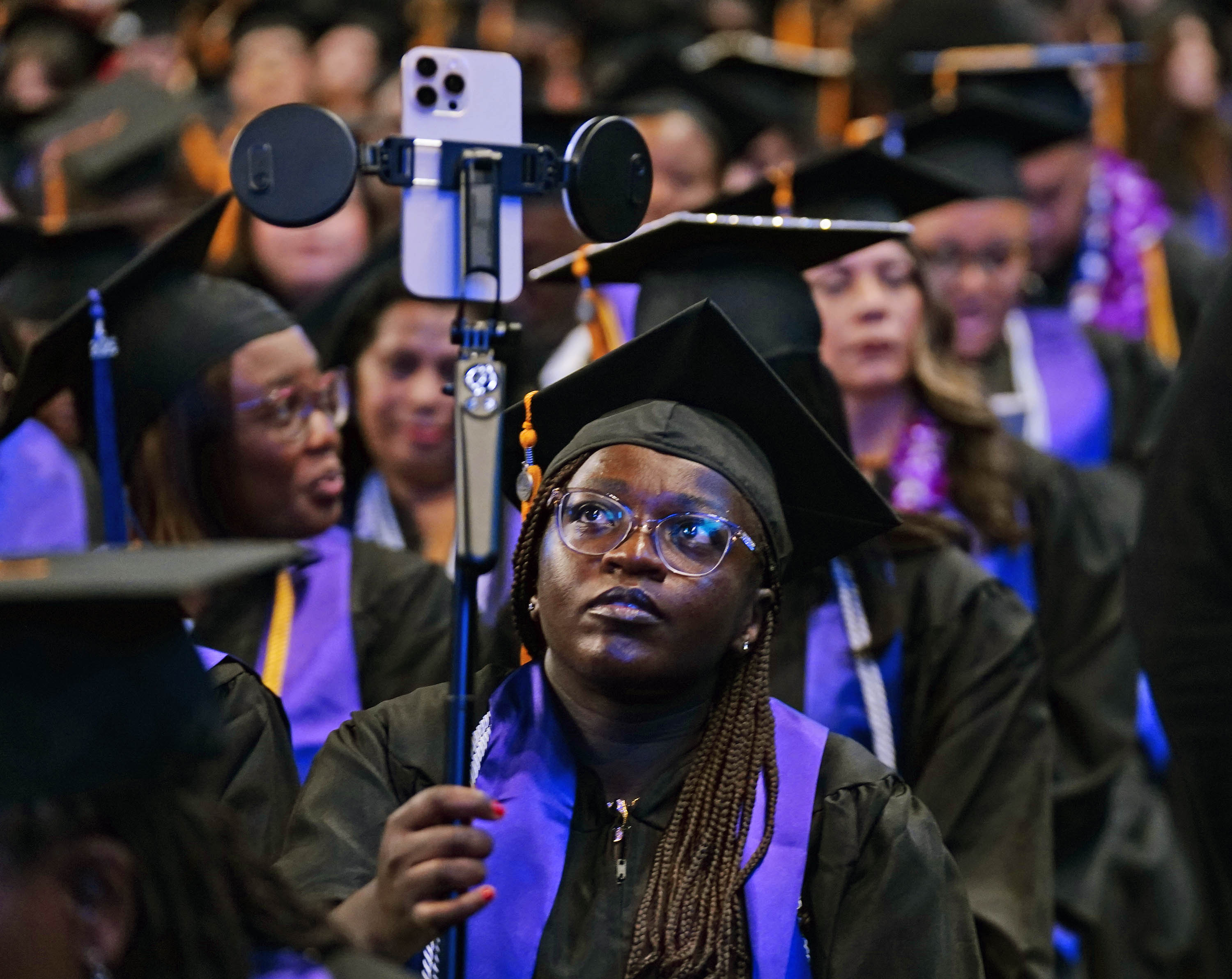 A student takes video of her fellow graduates during the Thursday morning commencement ceremony for online and cohort students at Global Credit Union Arena on Oct. 16, 2025. -