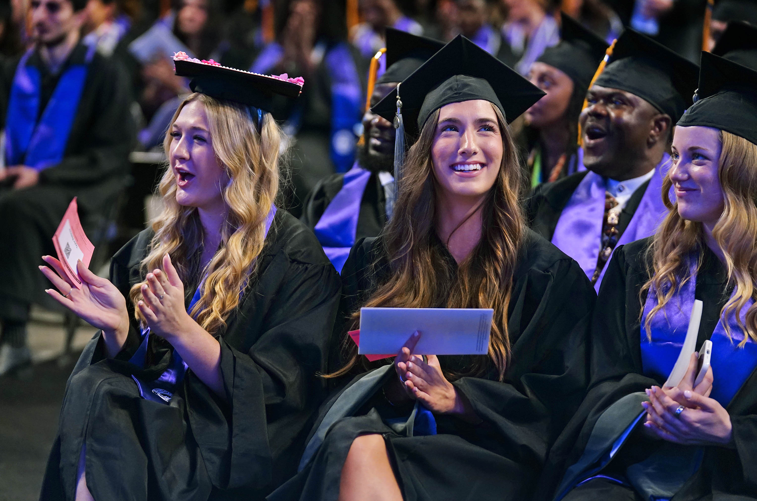 Graduates applaud their impending graduating during the Thursday morning fall commencement ceremony at Global Credit Union Arena on Oct. 16, 2025. -