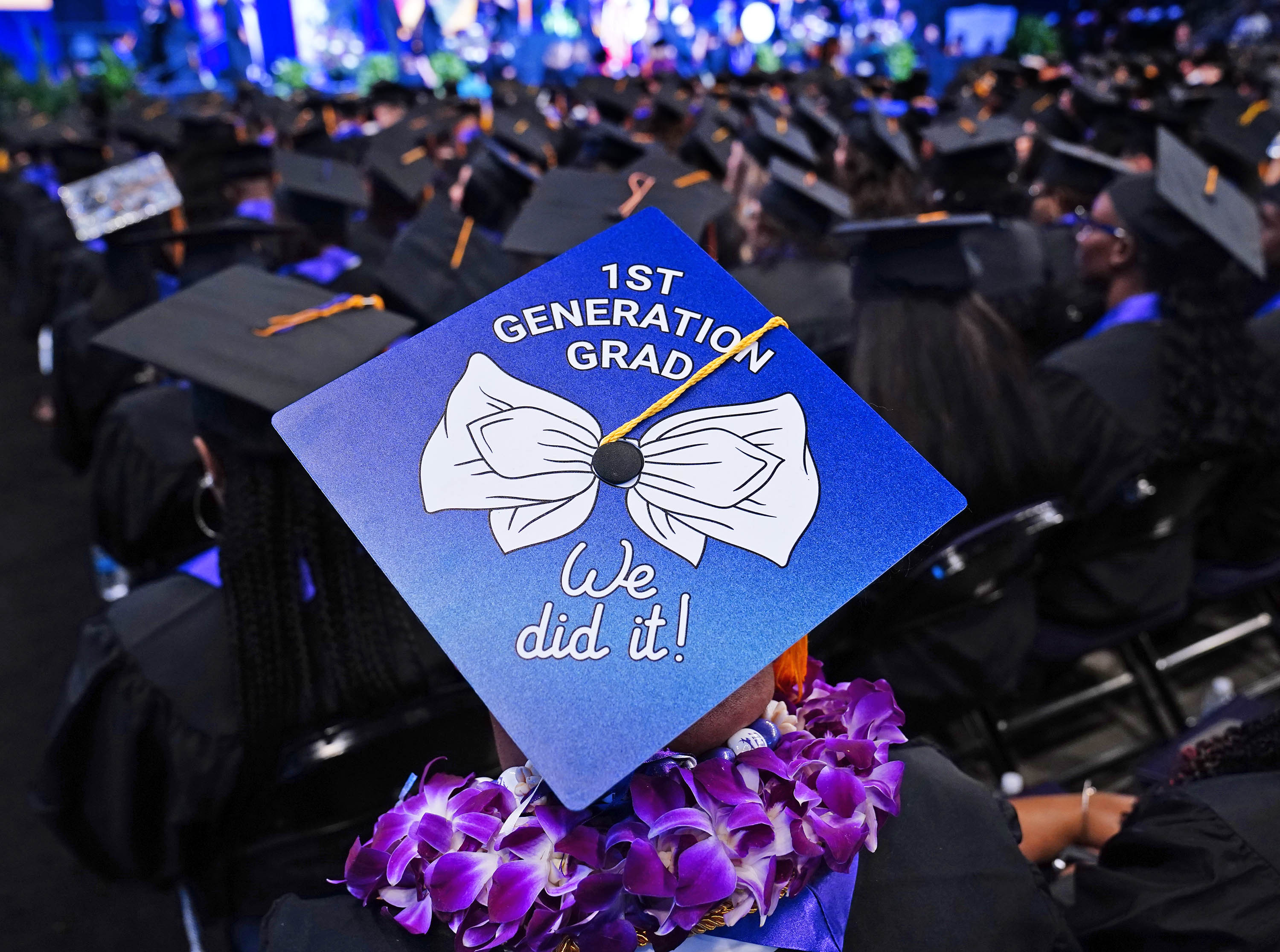 A first-generation graduate during the Thursday morning commencement ceremony for online and cohort students at Global Credit Union Arena on Oct. 16, 2025. -