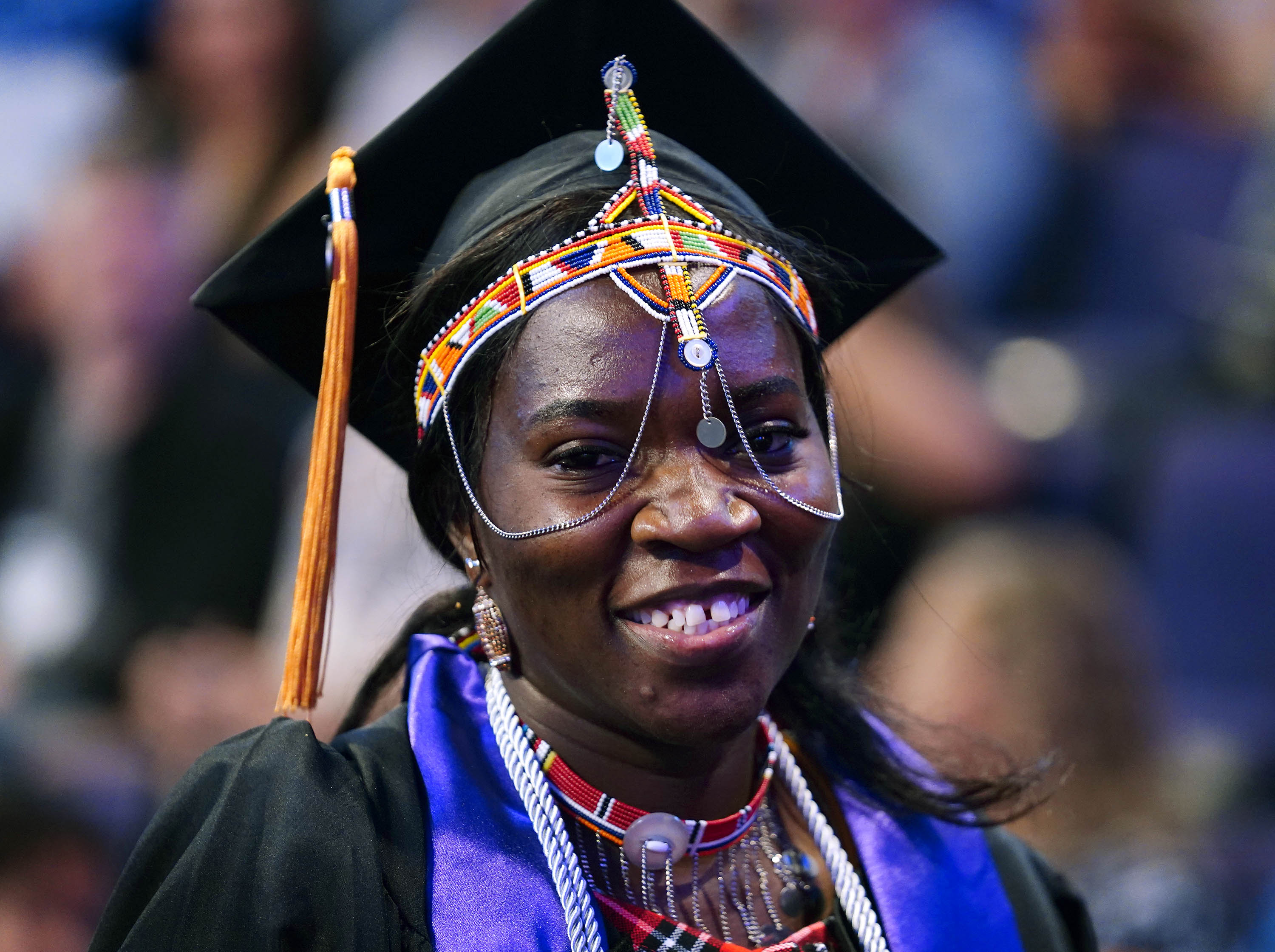 A graduate accents her mortarboard with a ceremonial Kenyan headdress during the Thursday morning fall commencement ceremony at Global Credit Union Arena on Oct. 16, 2025. -
