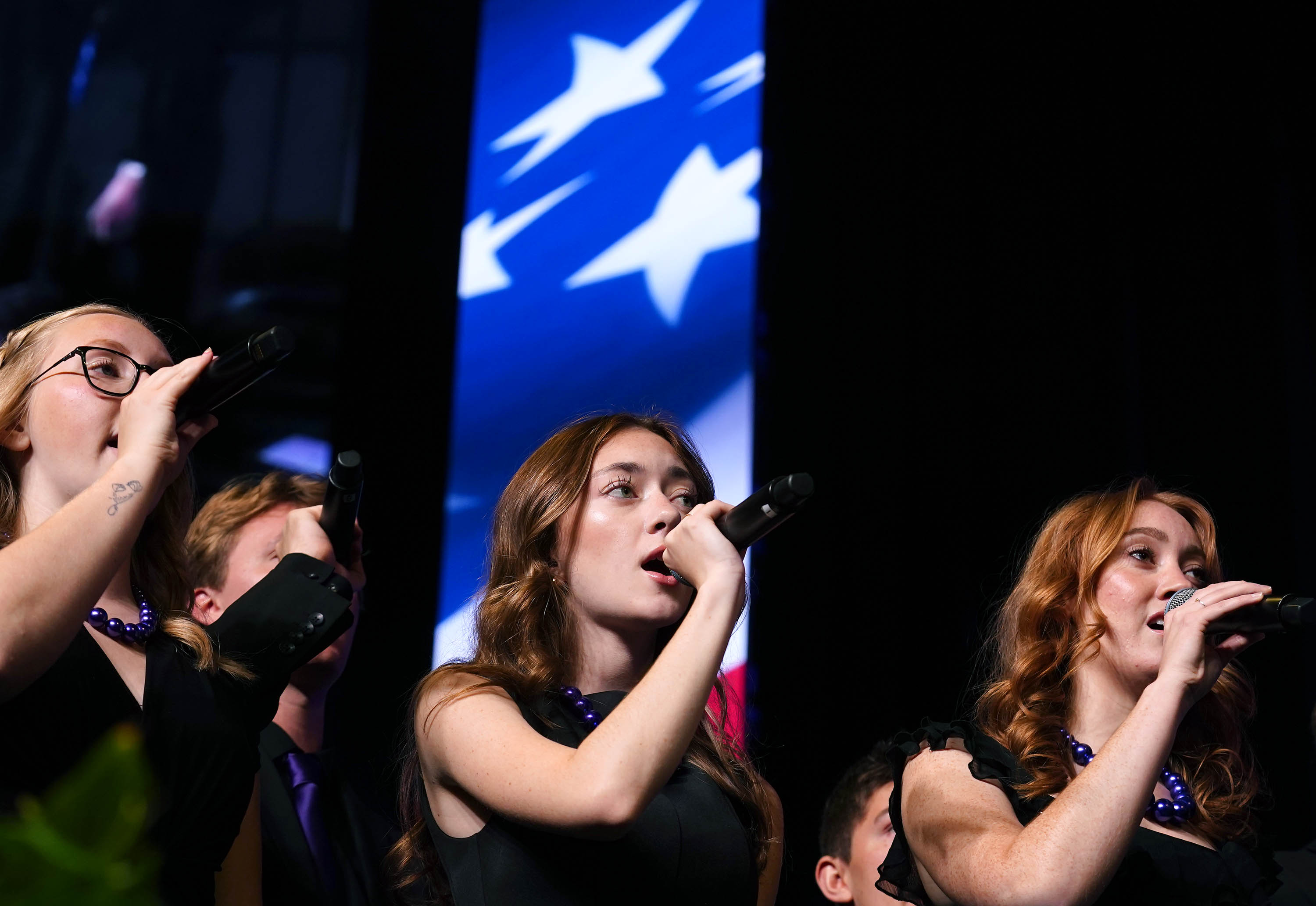 Members of Critical Mass sing the national anthem during the Thursday morning commencement ceremony for online and cohort students at Global Credit Union Arena on Oct. 16, 2025. -