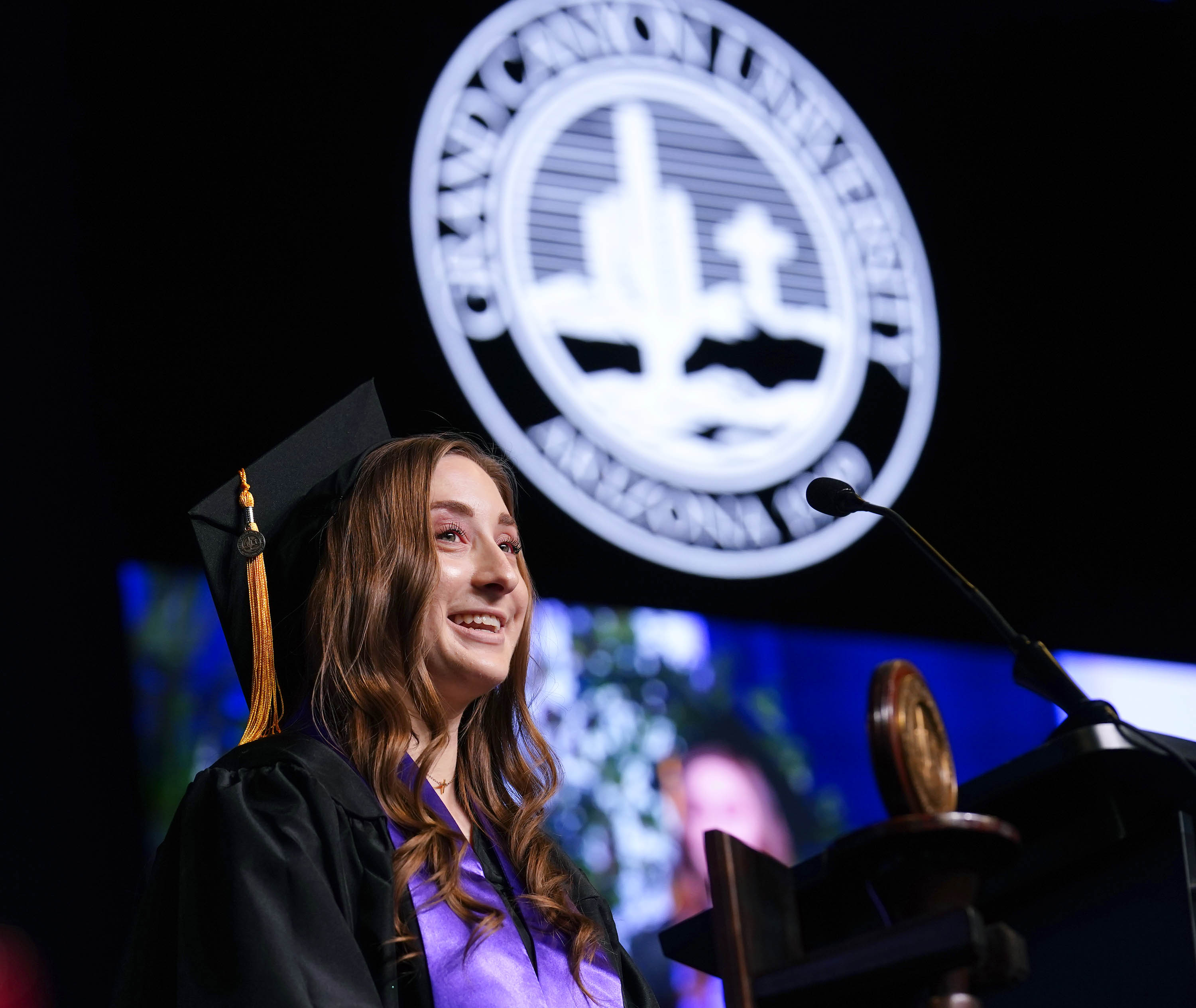 Student speaker Madison Bennett addresses her fellow graduates during the Thursday morning fall commencement ceremony at Global Credit Union Arena on Oct. 16, 2025. -