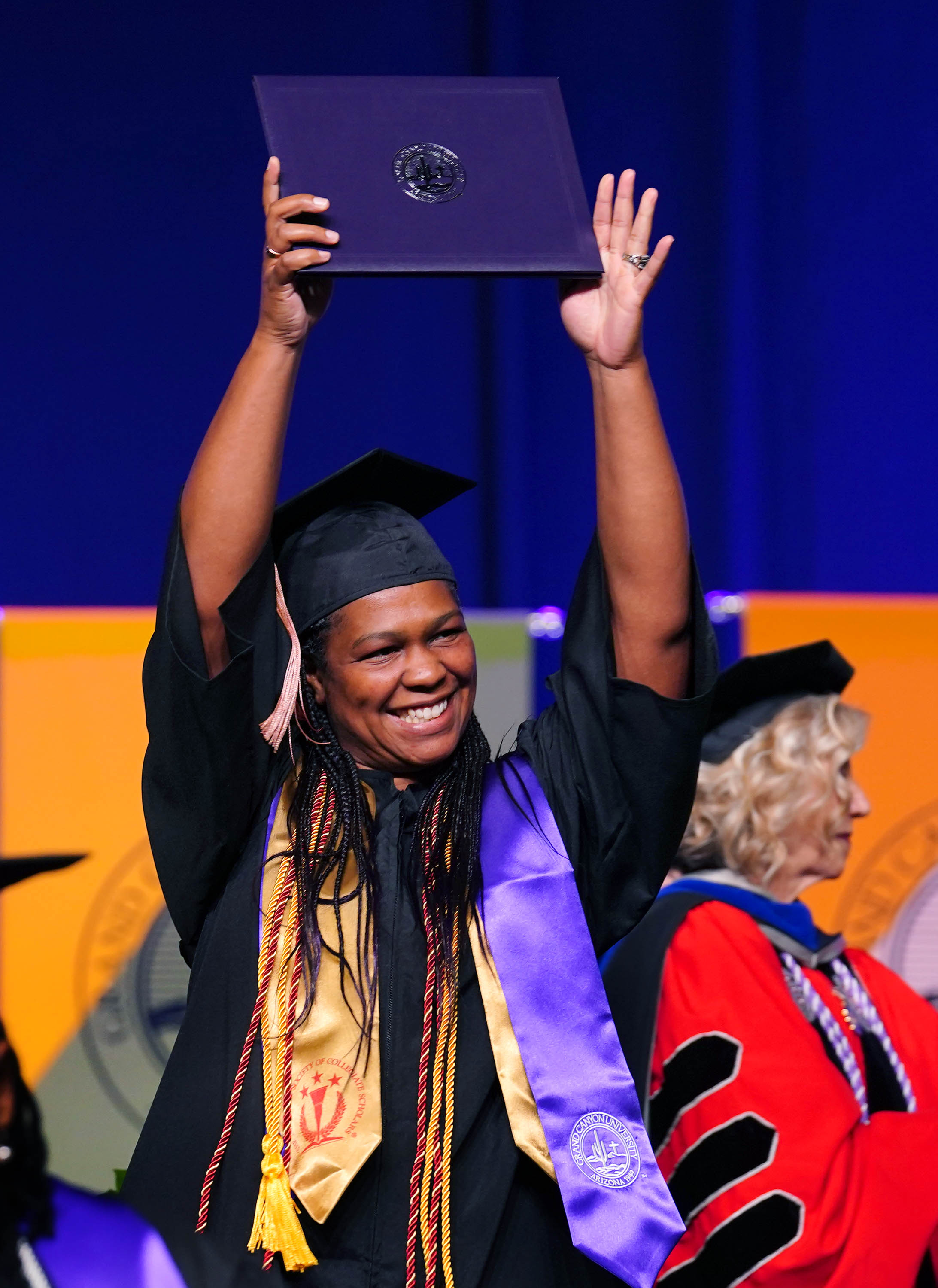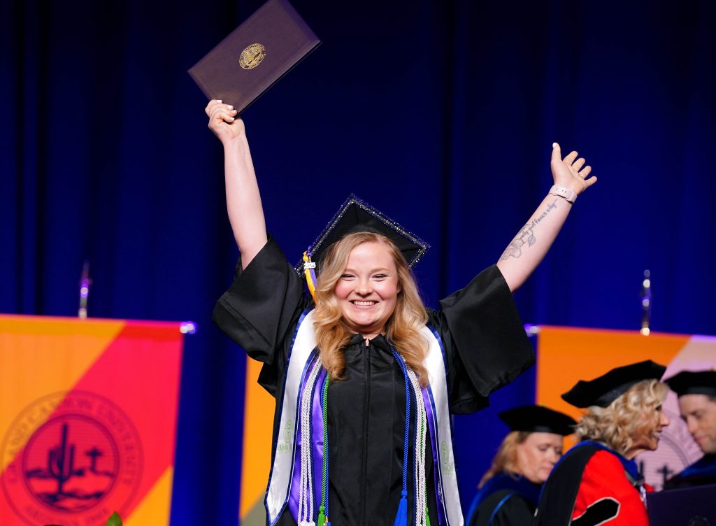 A graduate celebrates after receiving her diploma during the Thursday morning fall commencement ceremony at Global Credit Union Arena on Oct. 16, 2025. -