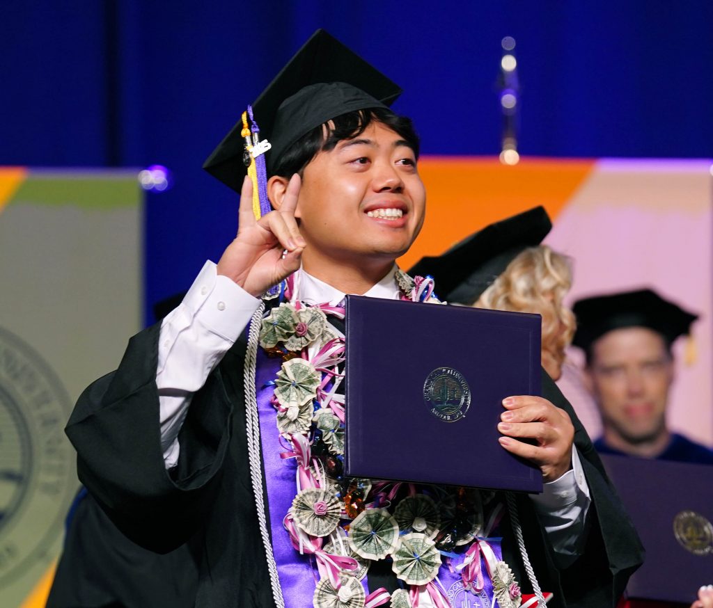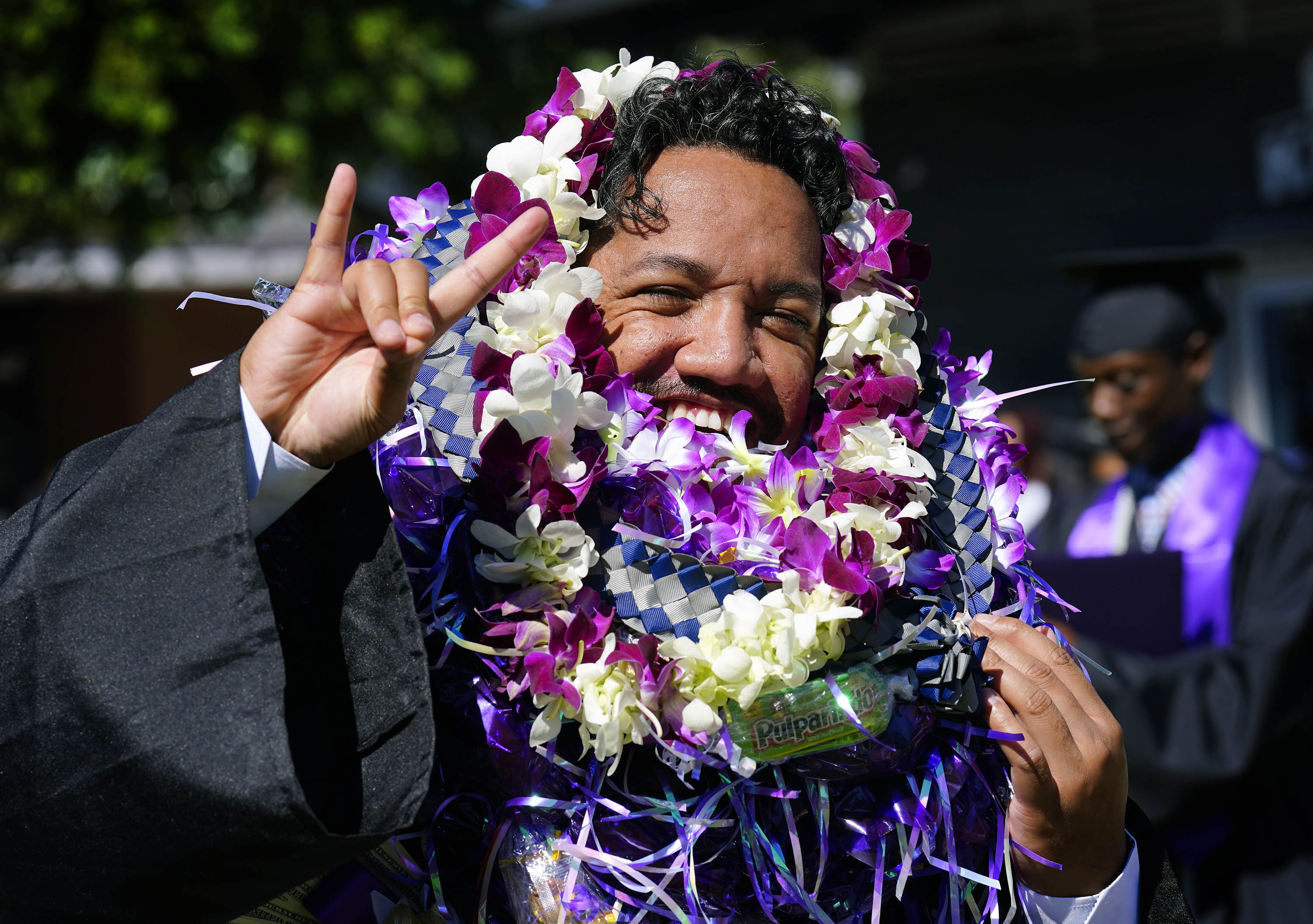 A graduate flashes a Lopes Up as he is covered in flowered leis during the Thursday morning fall commencement ceremony at Global Credit Union Arena on Oct. 16, 2025. -