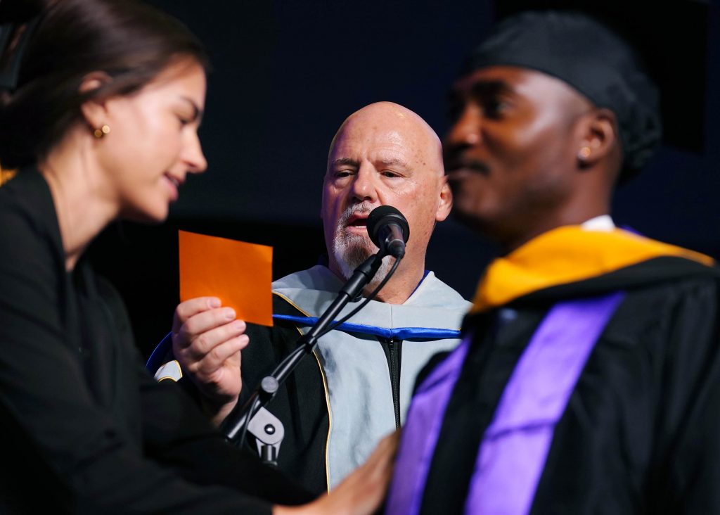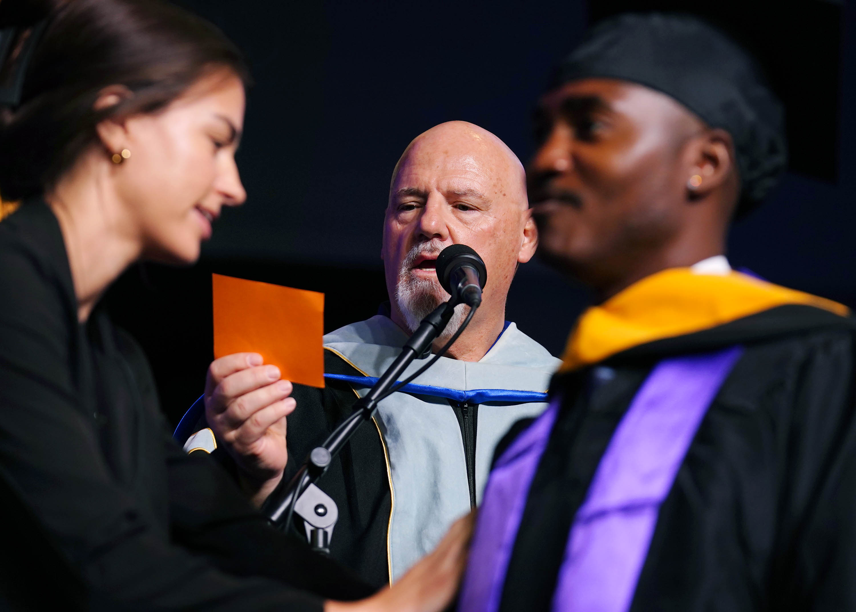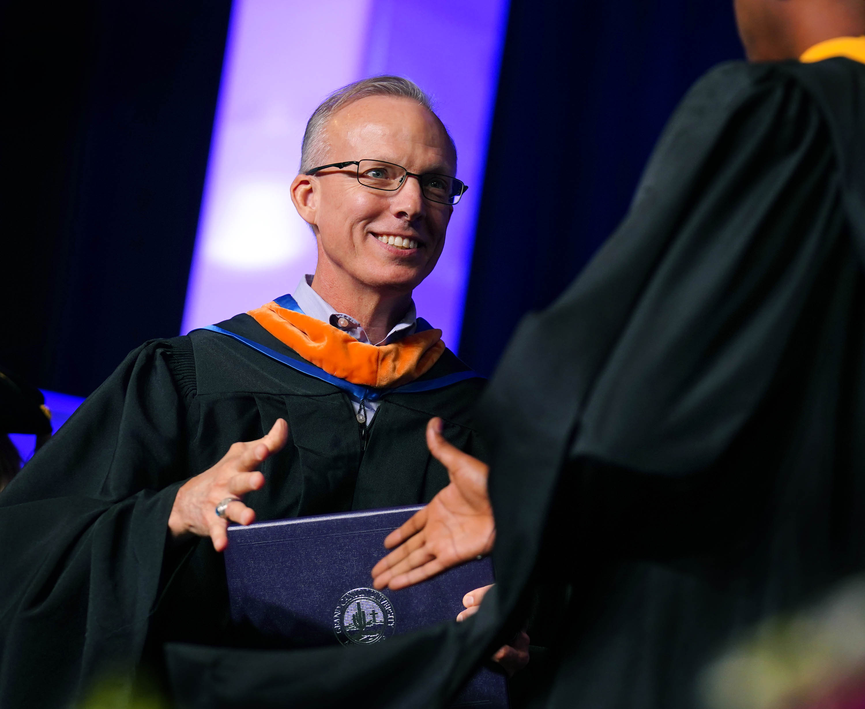 College of Engineering and Technology Dean Paul Lambertson congratulates graduates during the Thursday morning commencement ceremony for online and cohort students at Global Credit Union Arena on Oct. 16, 2025. -