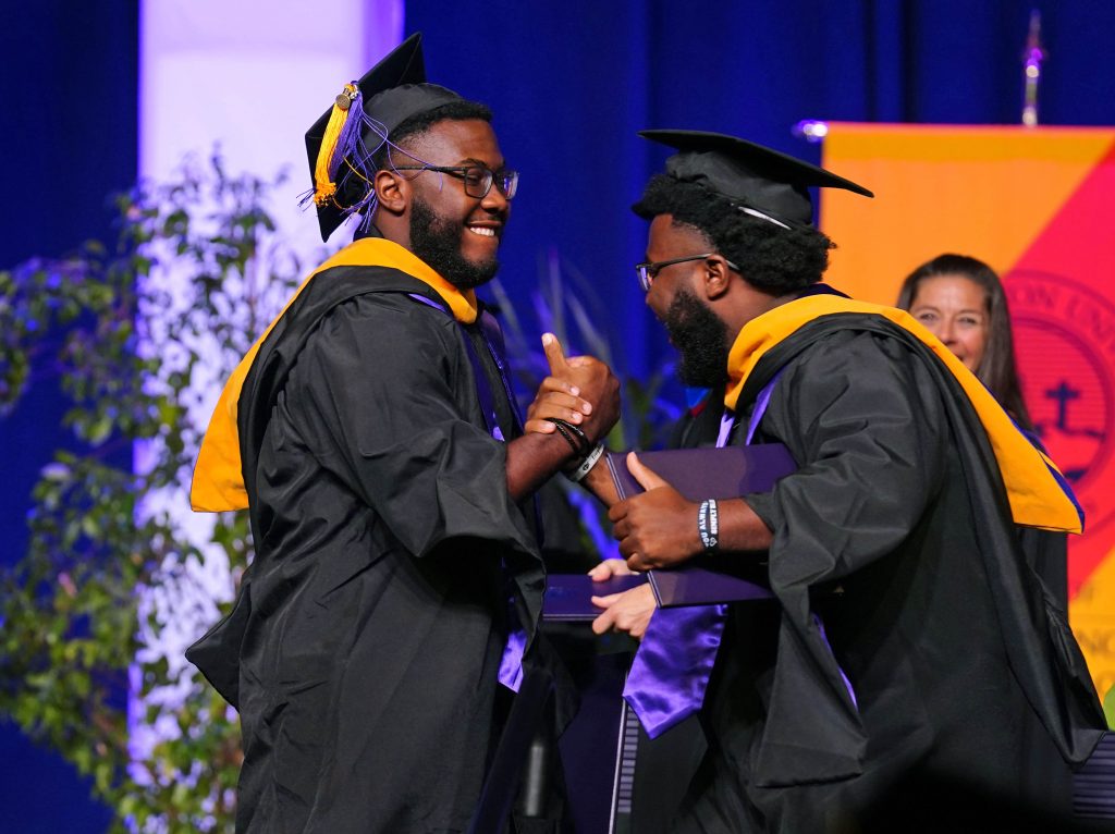 Brothers Joshua (left) and Caleb Peavy congratulate each other as they walk the stage together during the Thursday morning fall commencement ceremony at Global Credit Union Arena on Oct. 16, 2025. -