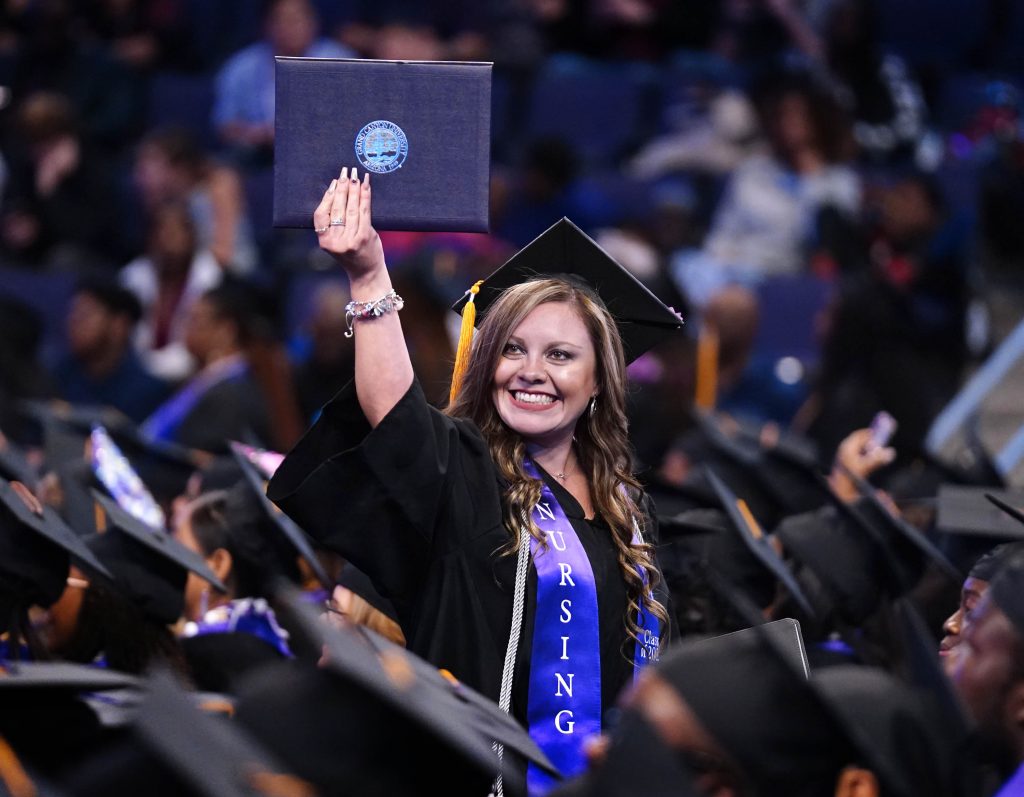 A graduate displays her diploma to family and friends in the crowd during the Thursday morning fall commencement ceremony at Global Credit Union Arena on Oct. 16, 2025. -