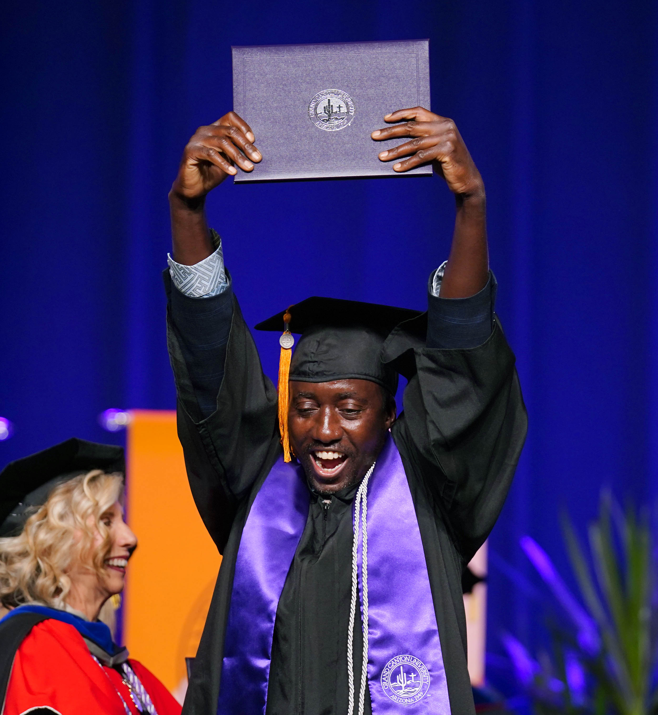 A graduate flashes a Lopes Up after receiving his diploma during the Thursday morning commencement ceremony for online and cohort students at Global Credit Union Arena on Oct. 16, 2025. -