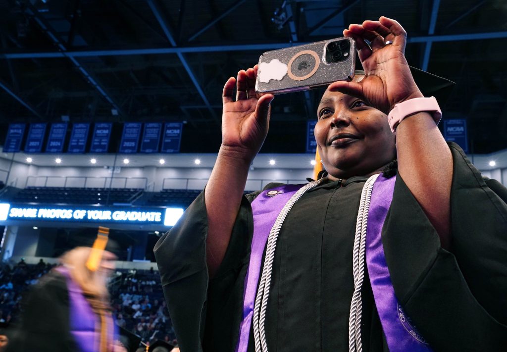 A graduate takes a video during the Thursday morning fall commencement ceremony at Global Credit Union Arena on Oct. 16, 2025. -