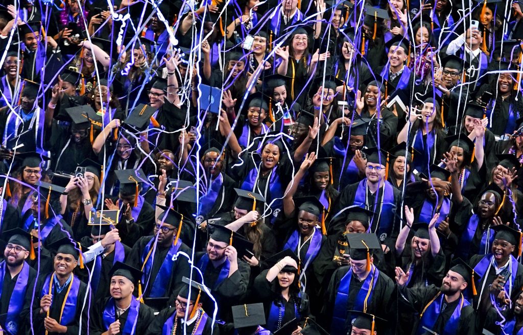 Graduates celebrate as streamers rain down during the Thursday morning fall commencement ceremony at Global Credit Union Arena on Oct. 16, 2025. -