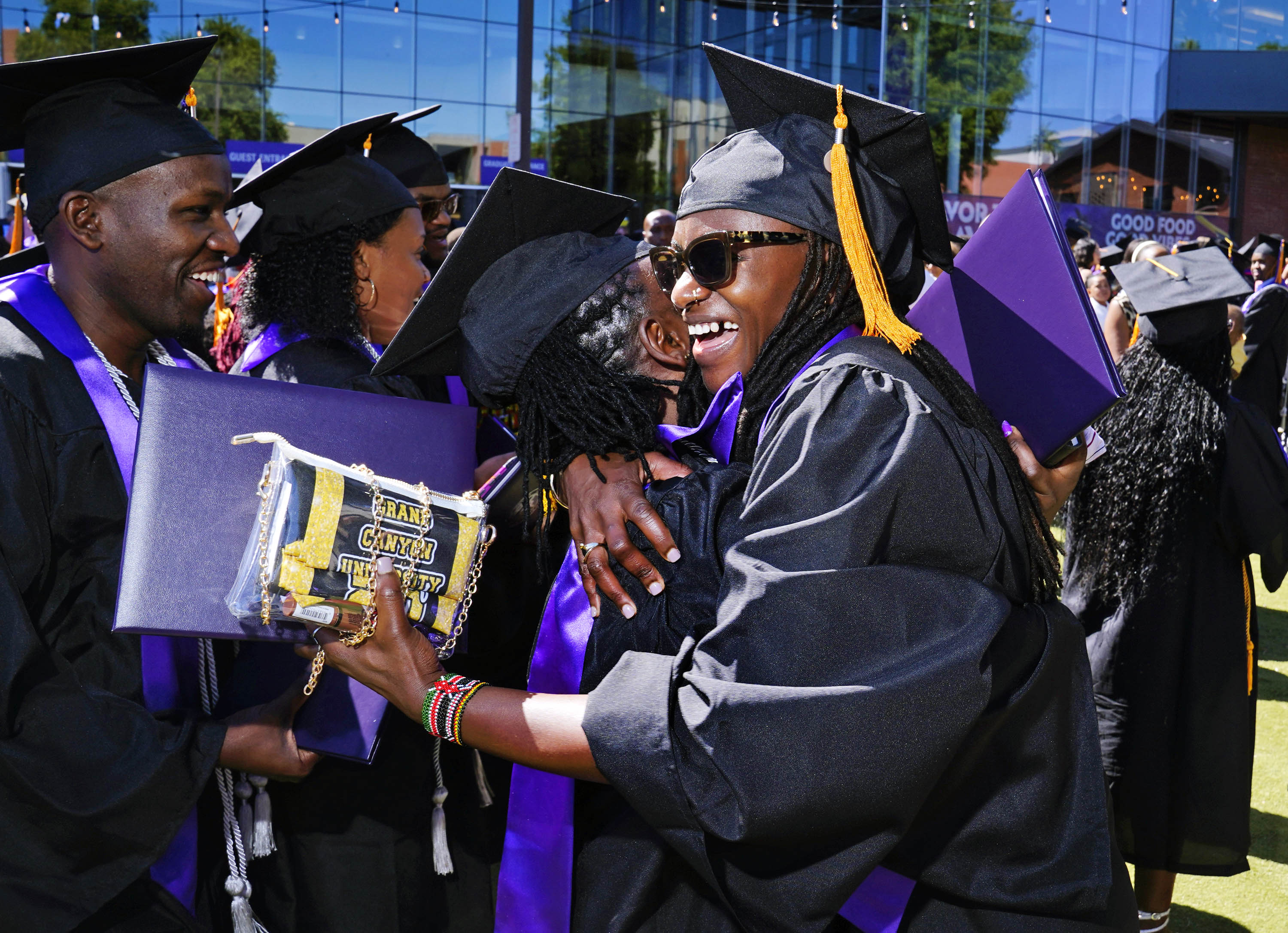 Graduates congratulate each other on the Quad following the Thursday morning fall commencement ceremony at Global Credit Union Arena on Oct. 16, 2025. -