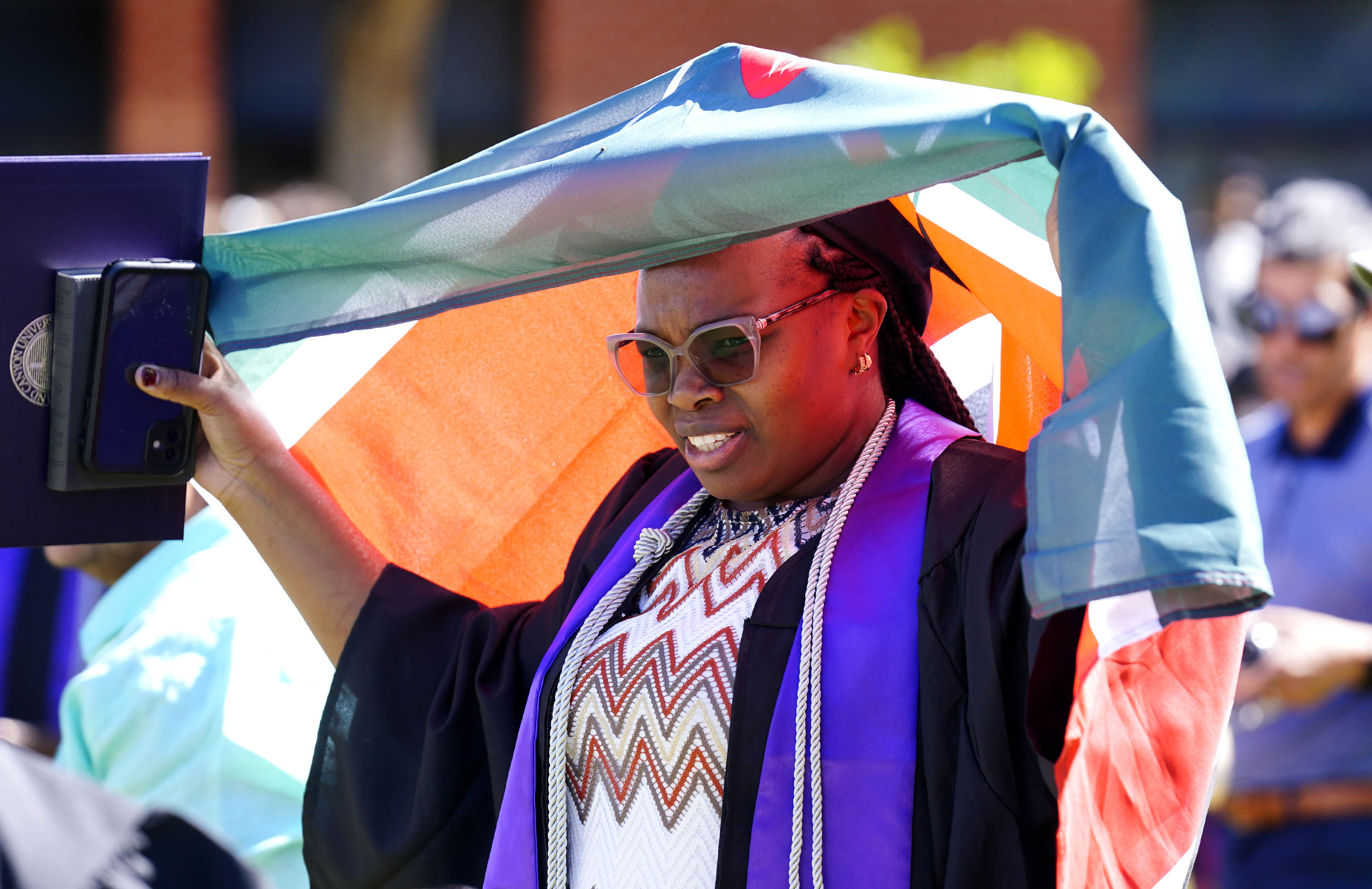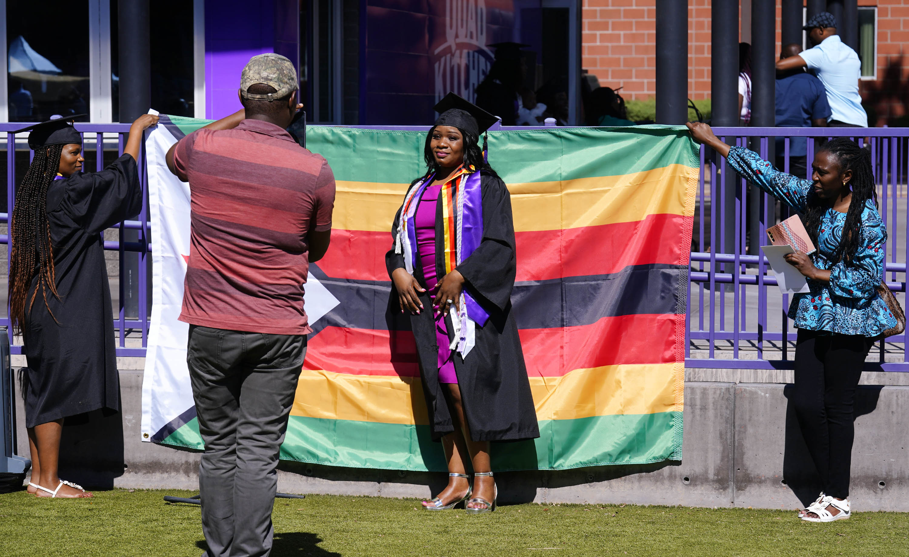 A graduate poses in front of a Zimbabwe flag during the Thursday morning commencement ceremony for online and cohort students at Global Credit Union Arena on Oct. 16, 2025. -