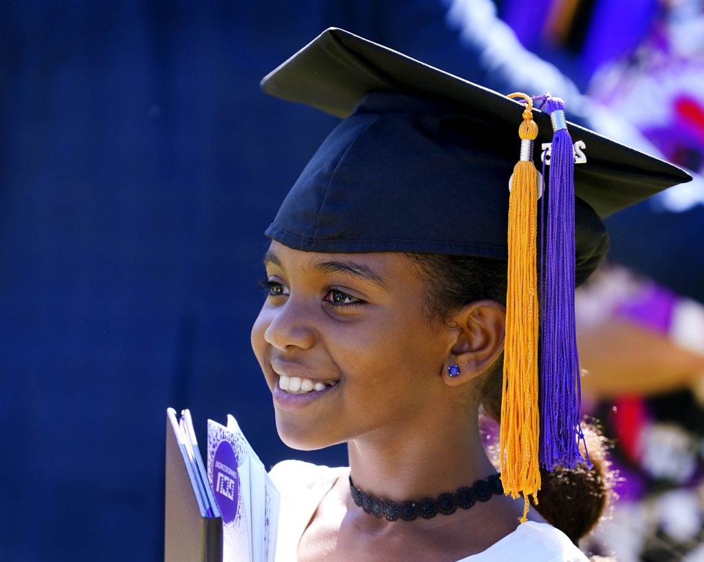 The daughter of an online student looks ready to graduate as she wears her father's mortarboard cap during the Thursday morning fall commencement ceremony at Global Credit Union Arena on Oct. 16, 2025. -