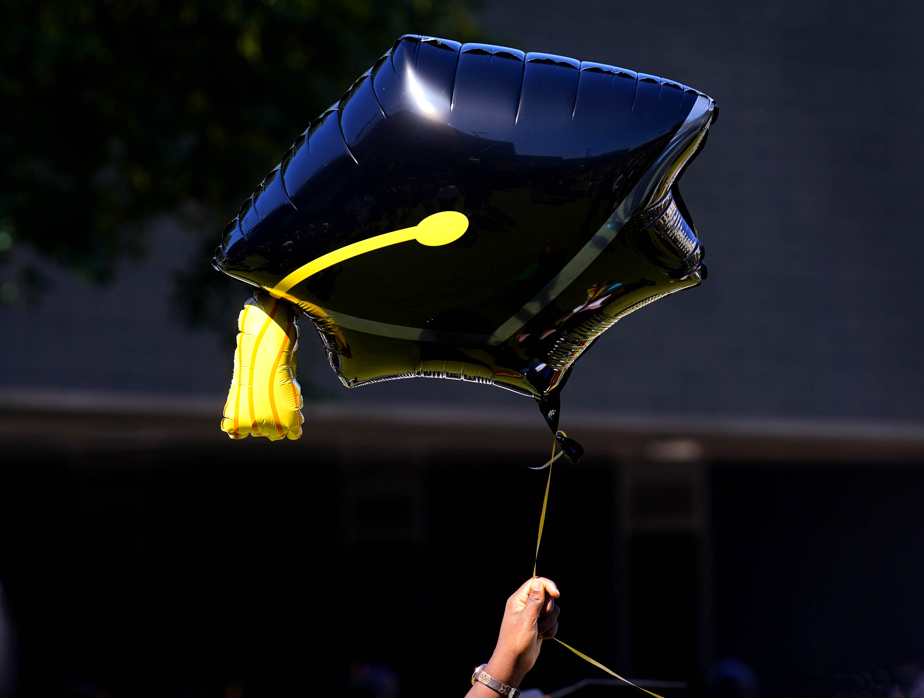 A mortarboard graduation balloon floats overhead as graduates are met by family and friends on the Quad during the Thursday morning commencement ceremony for online and cohort students at Global Credit Union Arena on Oct. 16, 2025.