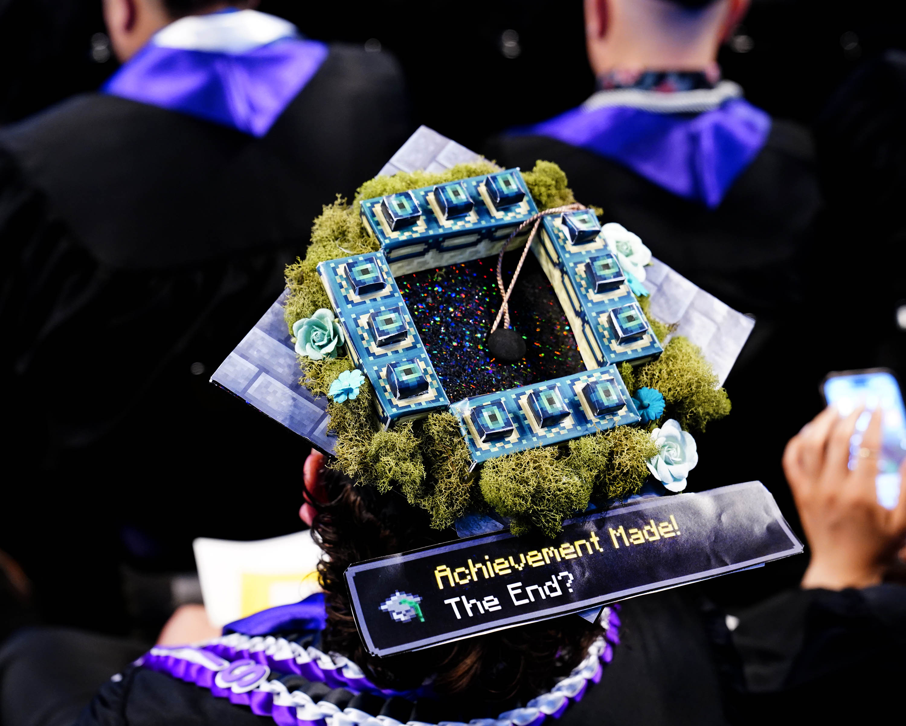 A graduate’s mortarboard art makes a Minecraft reference during the Thursday afternoon fall commencement ceremony at Global Credit Union Arena on Oct. 16, 2025. -