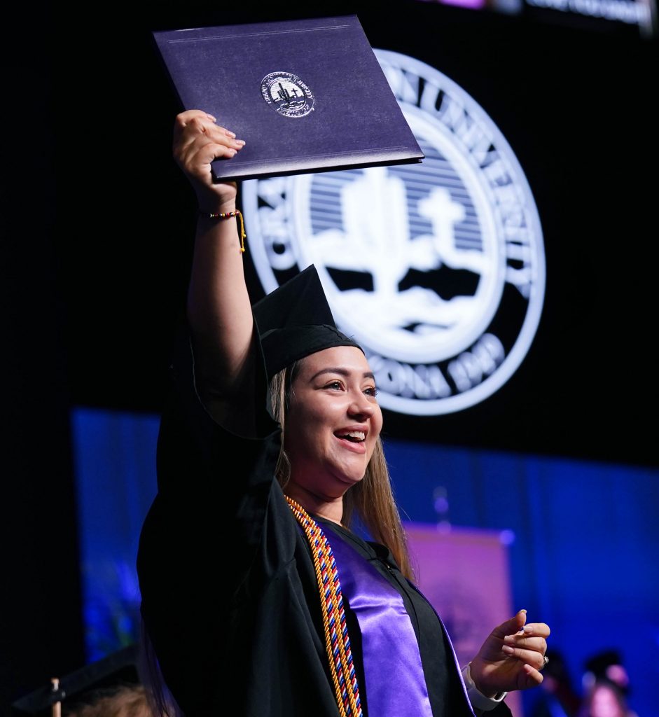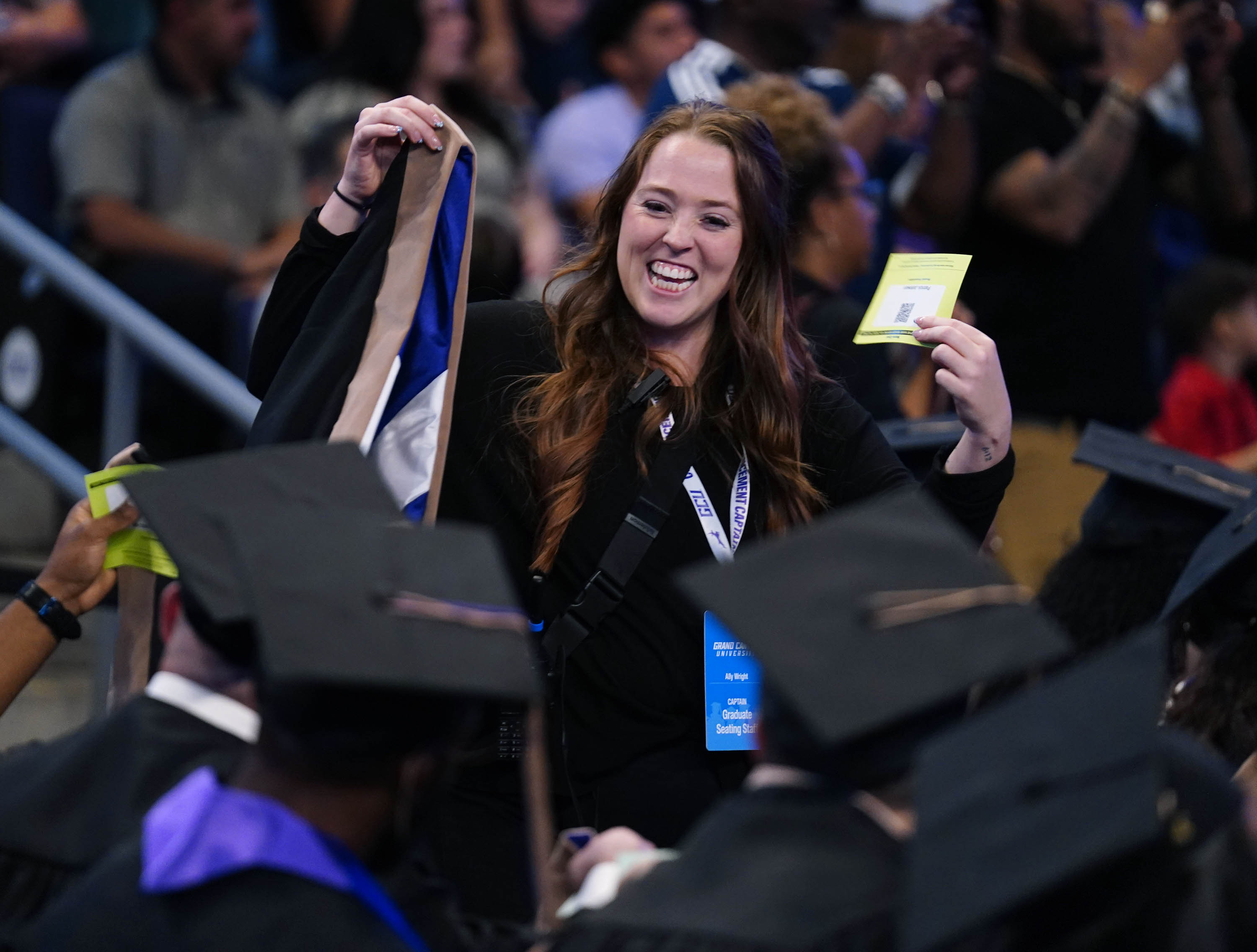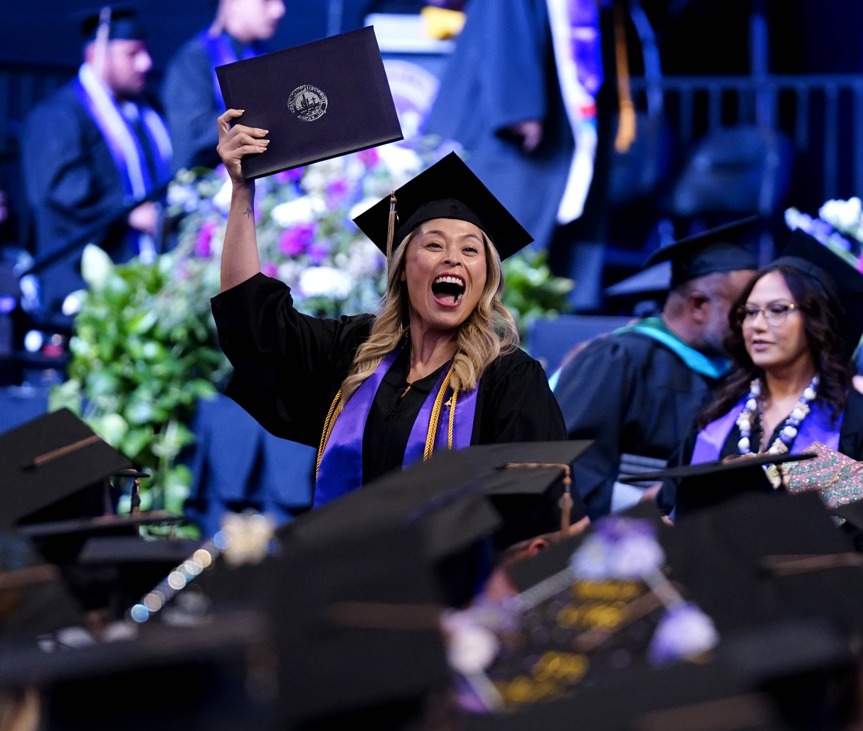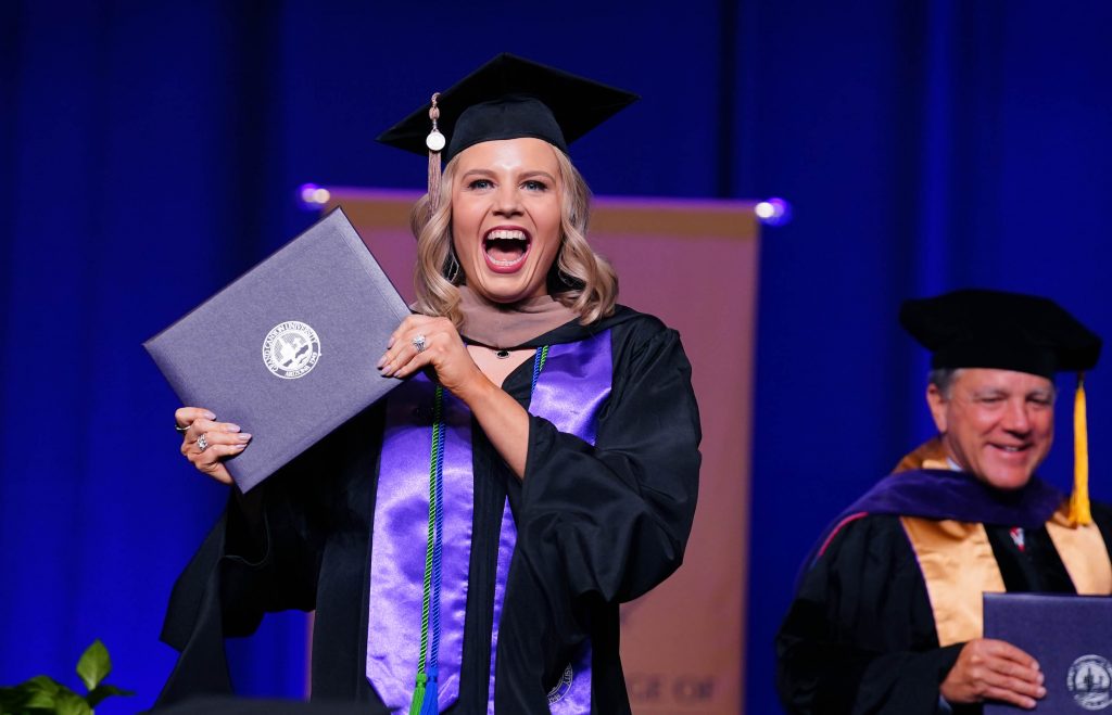 A graduate celebrates after receiving her diploma during the Thursday afternoon commencement ceremony for online and cohort students at Global Credit Union Arena on Oct. 16, 2025. -