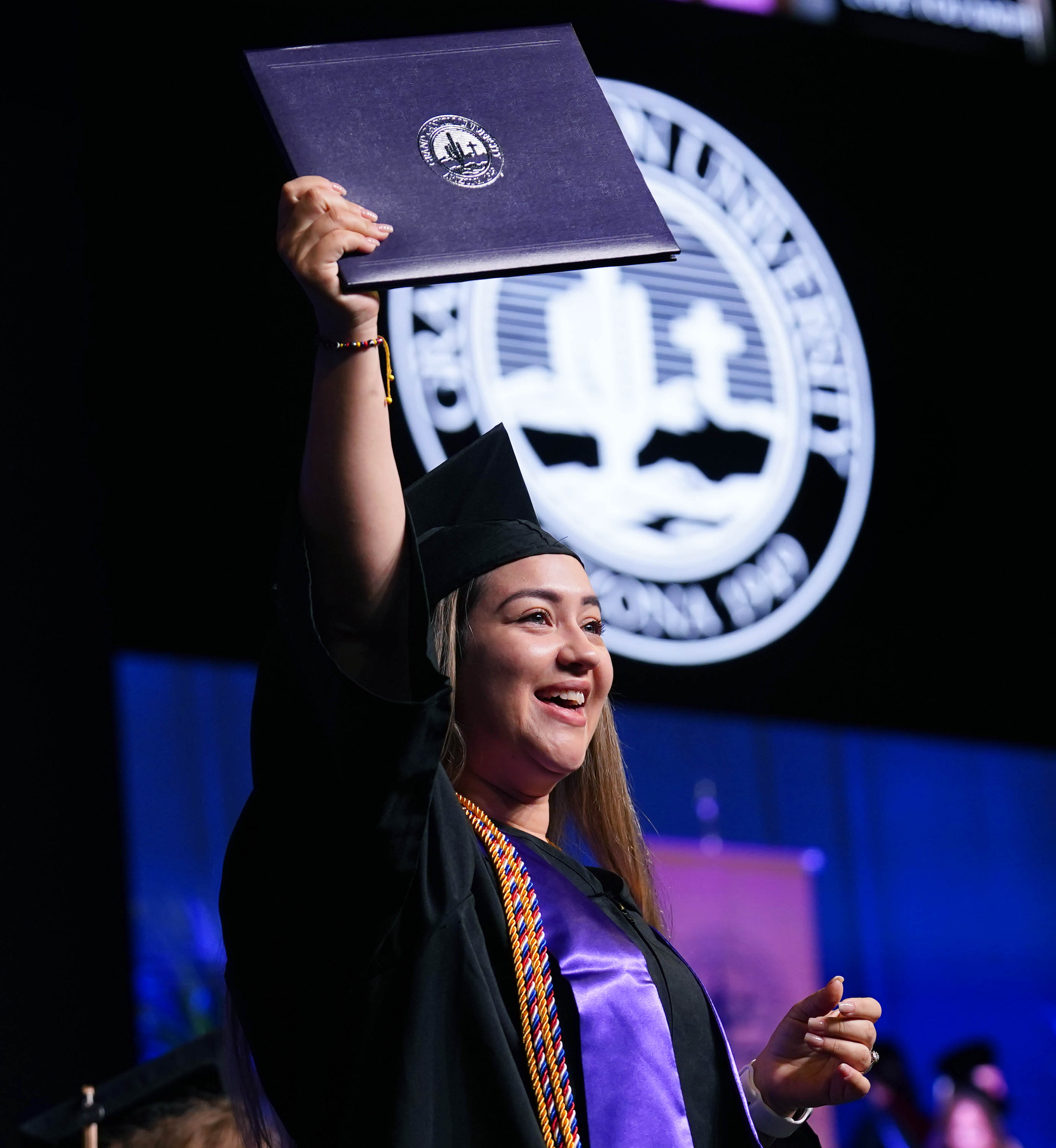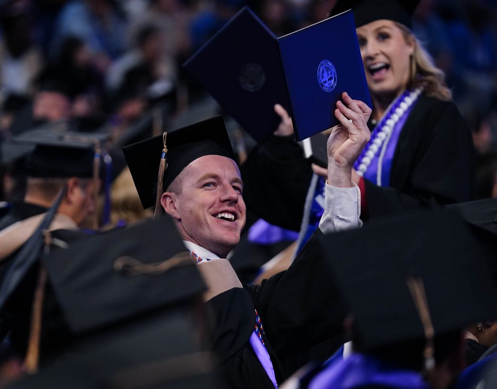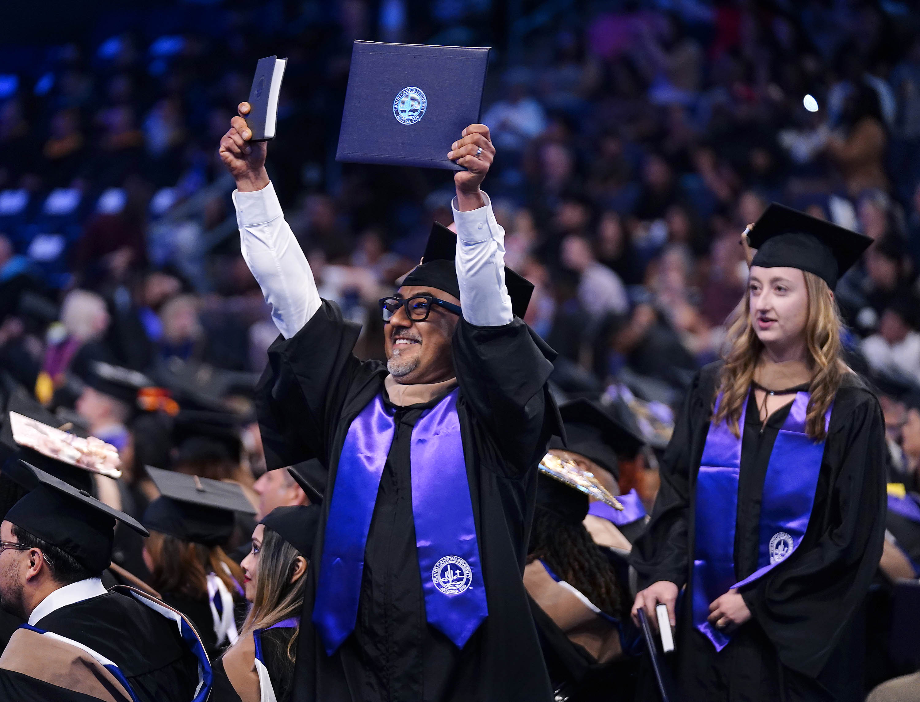 A graduate displays his diploma to family members in the audience during the Thursday afternoon commencement ceremony for online and cohort students at Global Credit Union Arena on Oct. 16, 2025. -