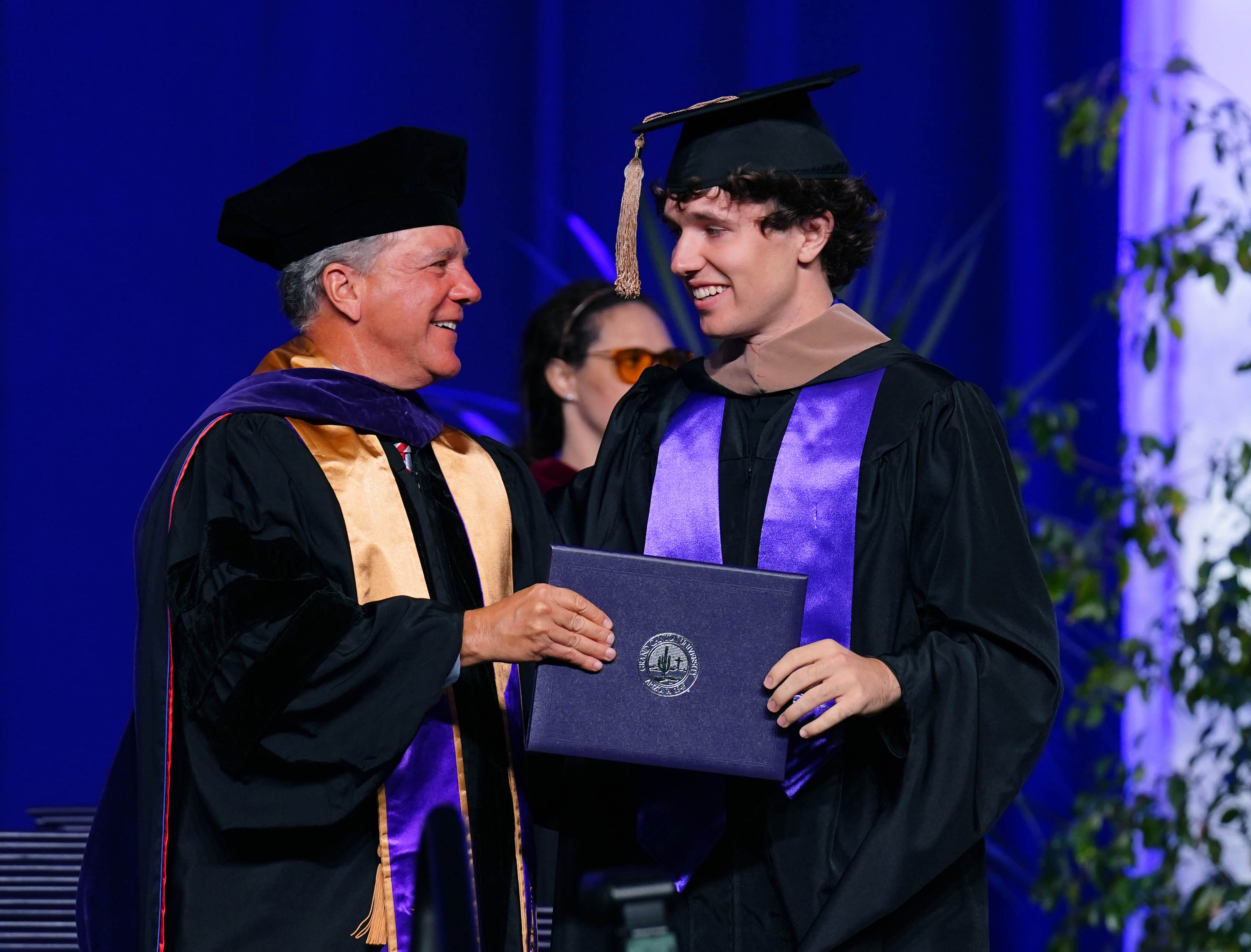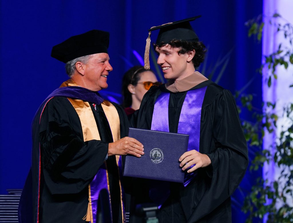 Colangelo College of Business Dean John Kaites congratulates master's graduate Connor Vicary during the Thursday afternoon fall commencement ceremony at Global Credit Union Arena on Oct. 16, 2025. -