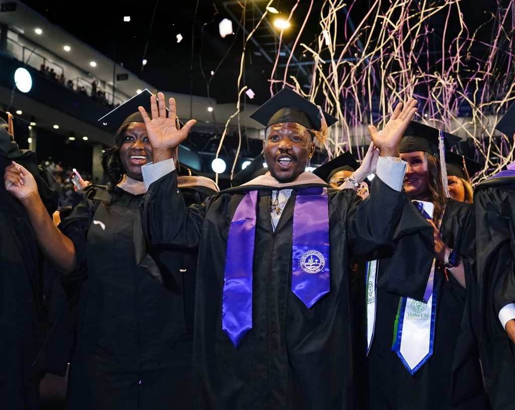 Graduates celebrate after receiving their diplomas during the Thursday afternoon commencement ceremony for online and cohort students at Global Credit Union Arena on Oct. 16, 2025. -