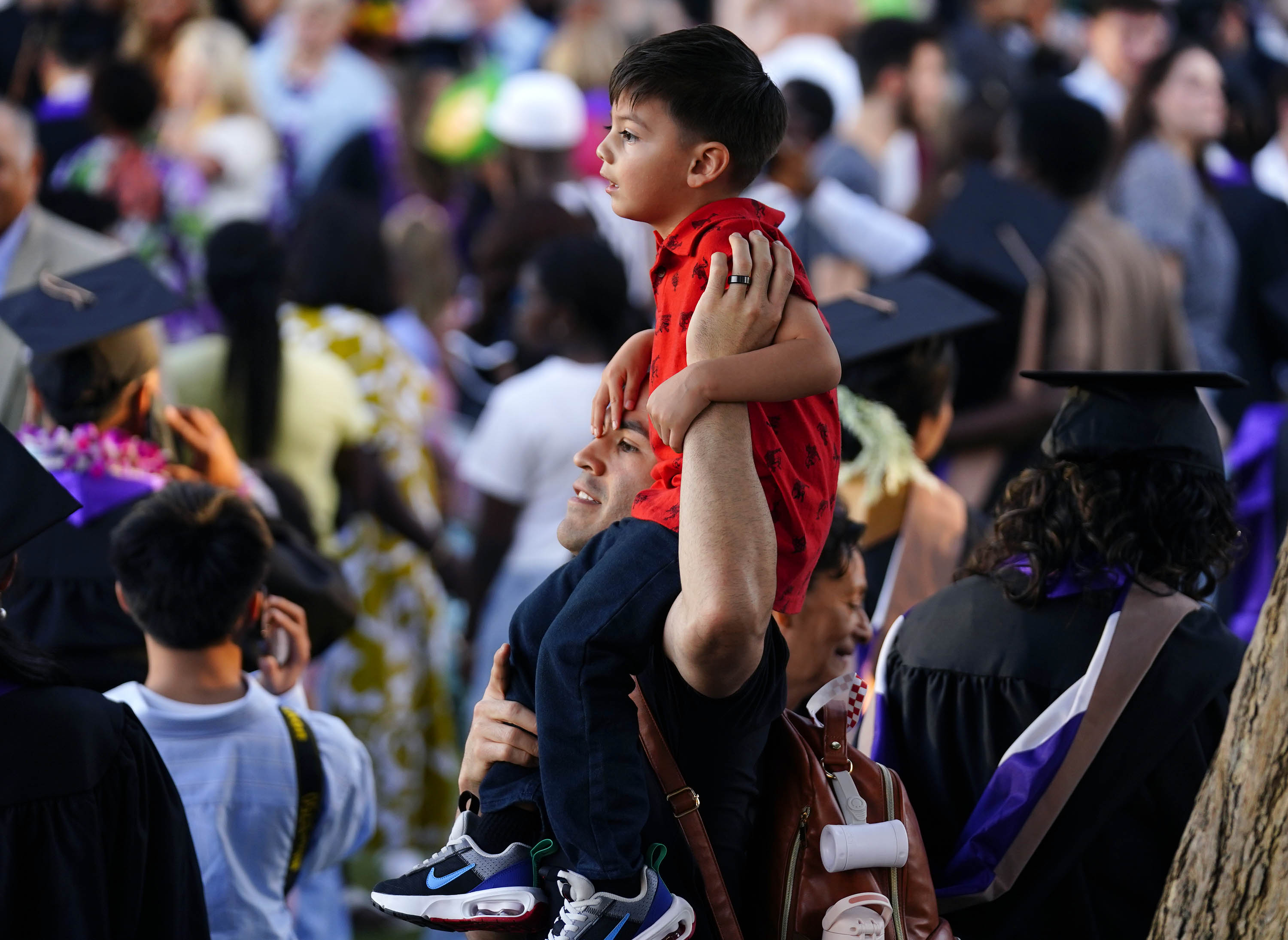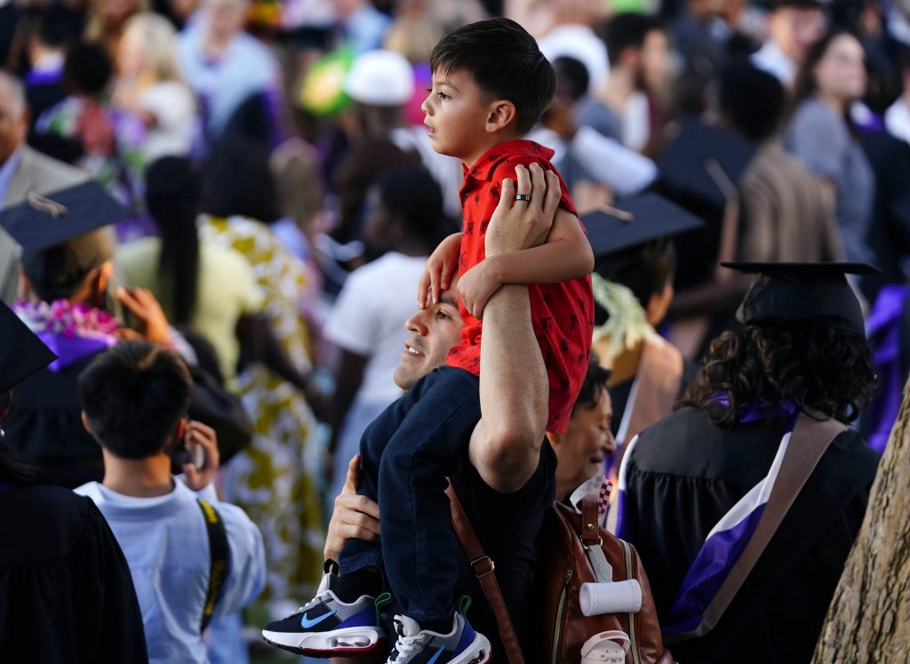 Family members search for their graduates in the crowd on the Quad following the Thursday afternoon commencement ceremony for online and cohort students at Global Credit Union Arena on Oct. 16, 2025. -