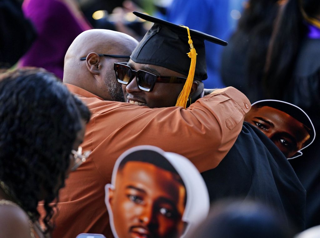 Fraduates are met with hugs by family members on the Quad following the Thursday afternoon fall commencement ceremony at Global Credit Union Arena on Oct. 16, 2025. -