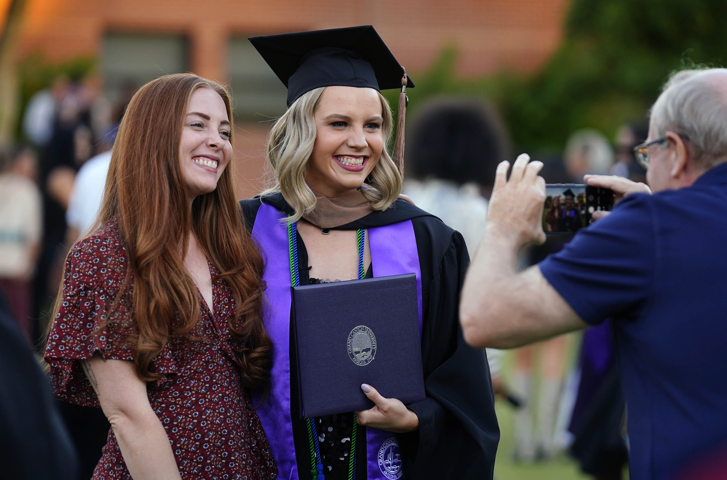 Graduates take photos with family members as they bask in the glow of their achievement following the Thursday afternoon commencement ceremony for online and cohort students at Global Credit Union Arena on Oct. 16, 2025. -