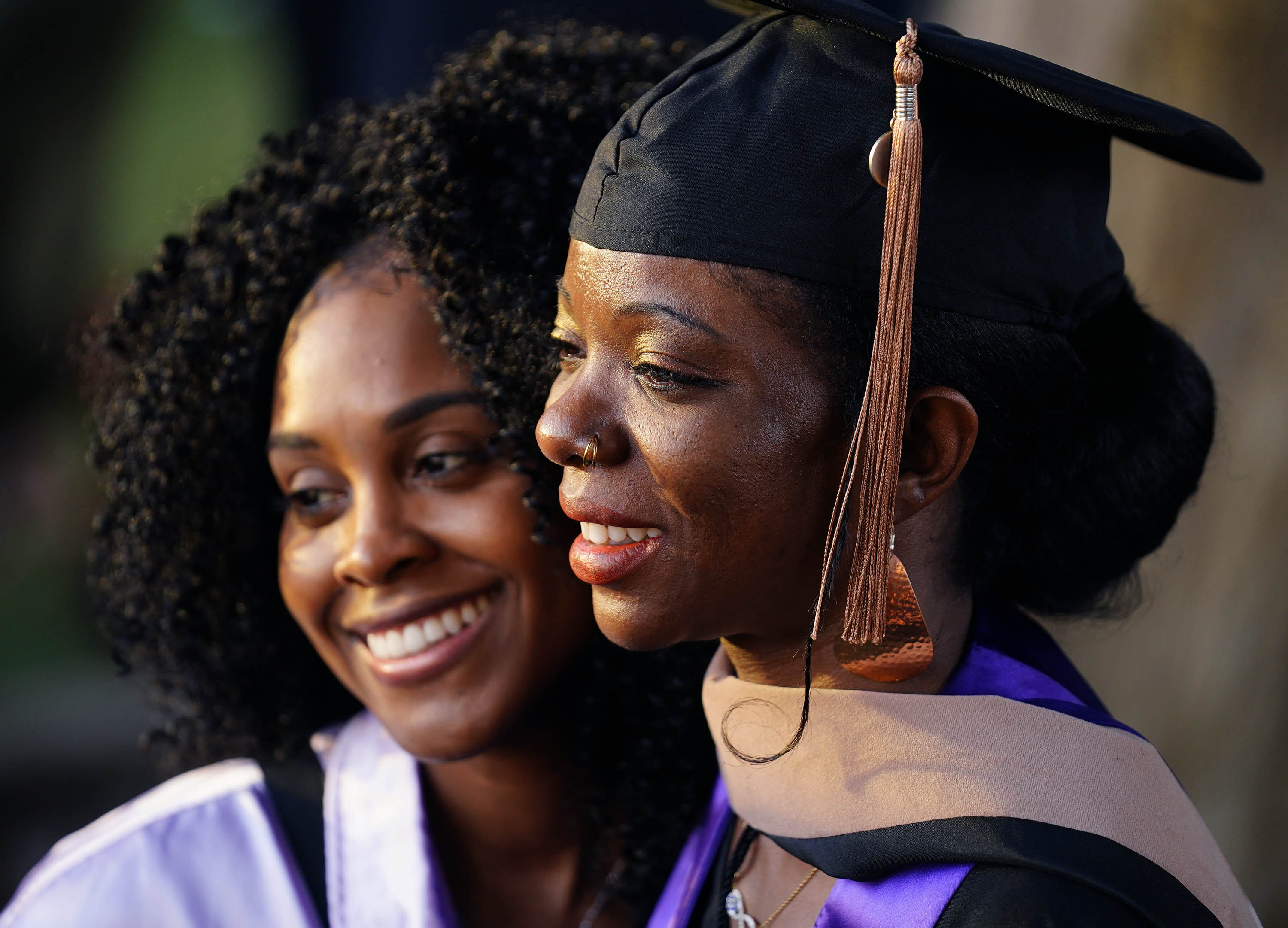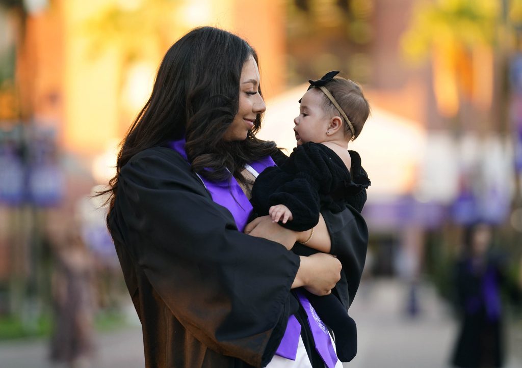 A graduate shares a moment with her daughter following the Thursday afternoon fall commencement ceremony at Global Credit Union Arena on Oct. 16, 2025. -