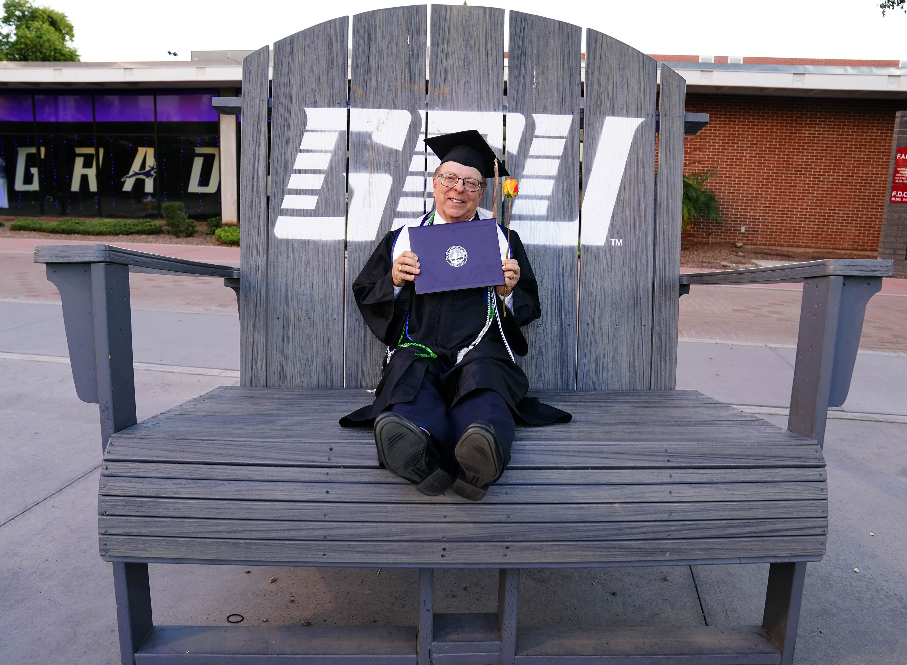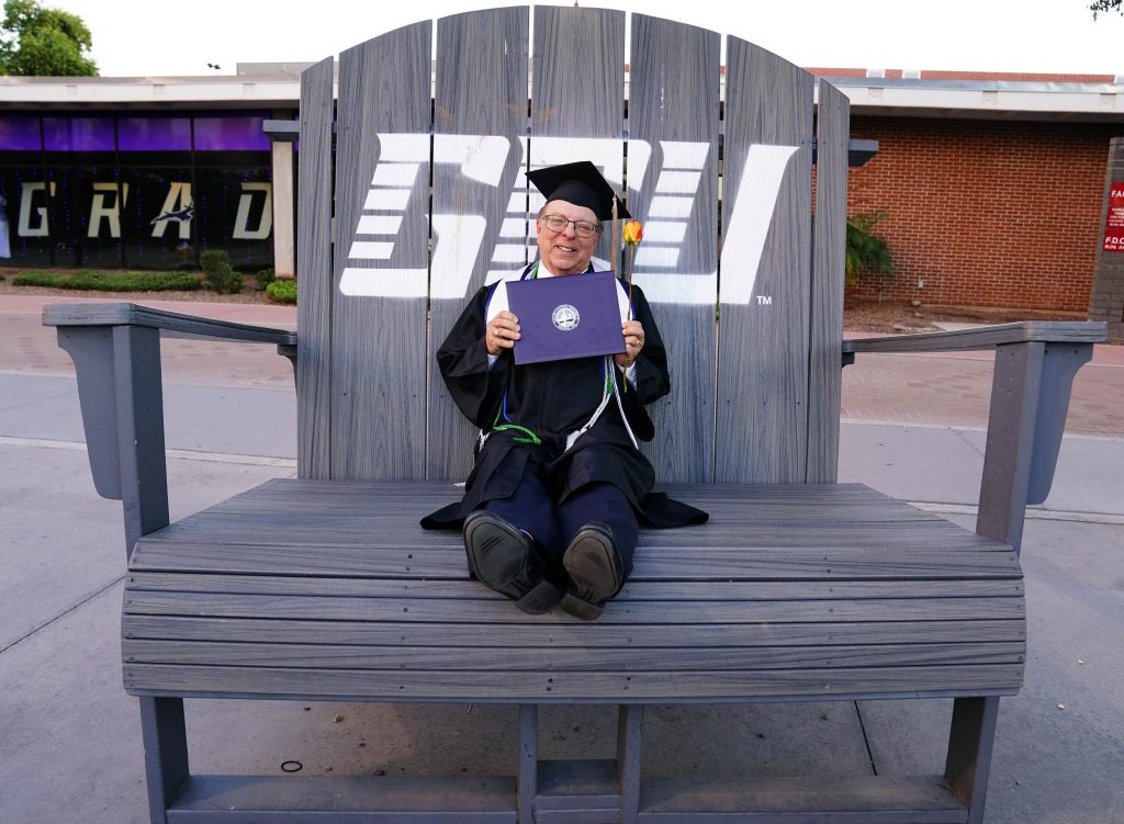 A big chair for a big accomplishment, an online graduate shows off his achievement following the Thursday afternoon commencement ceremony for online and cohort students at Global Credit Union Arena on Oct. 16, 2025.