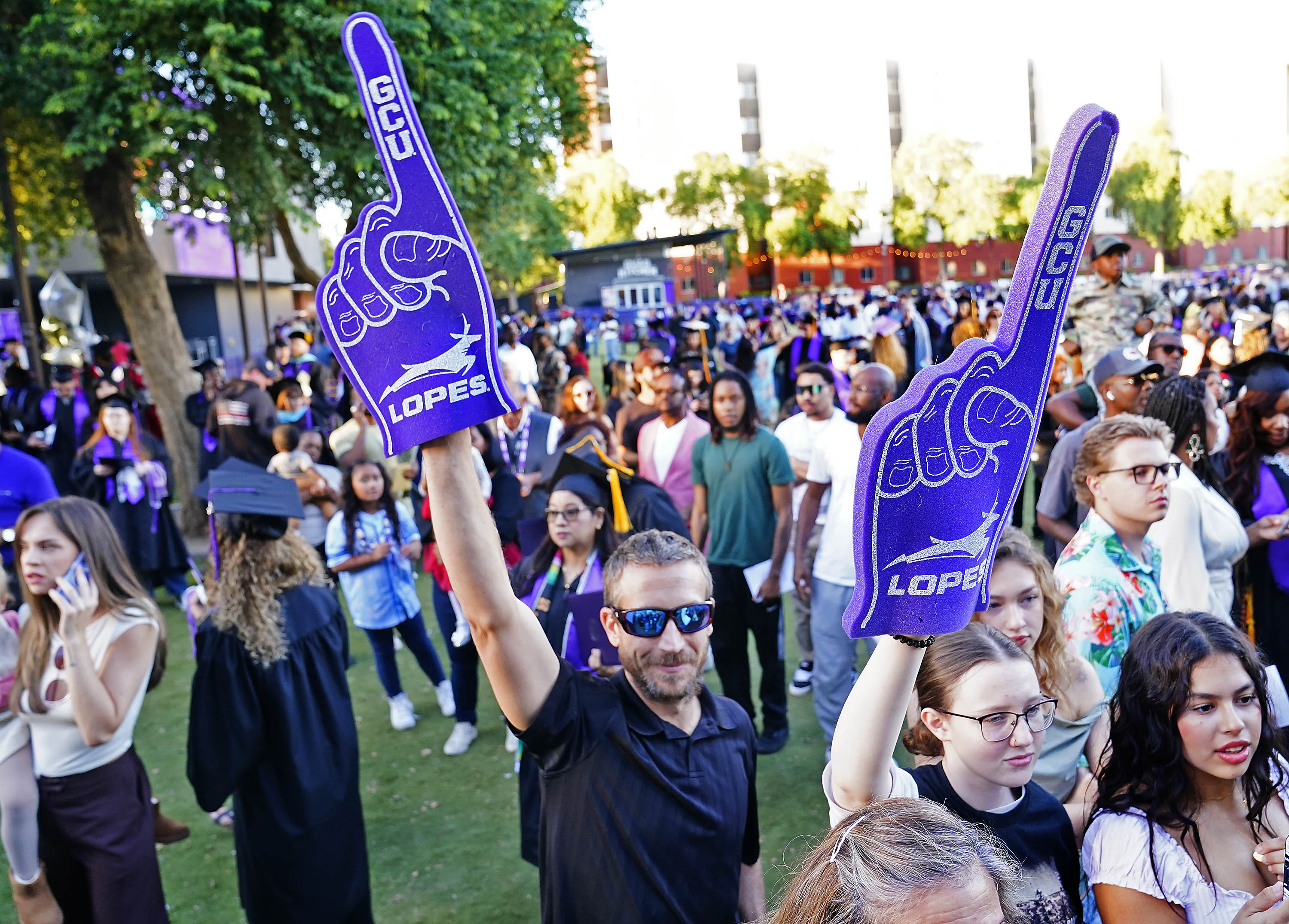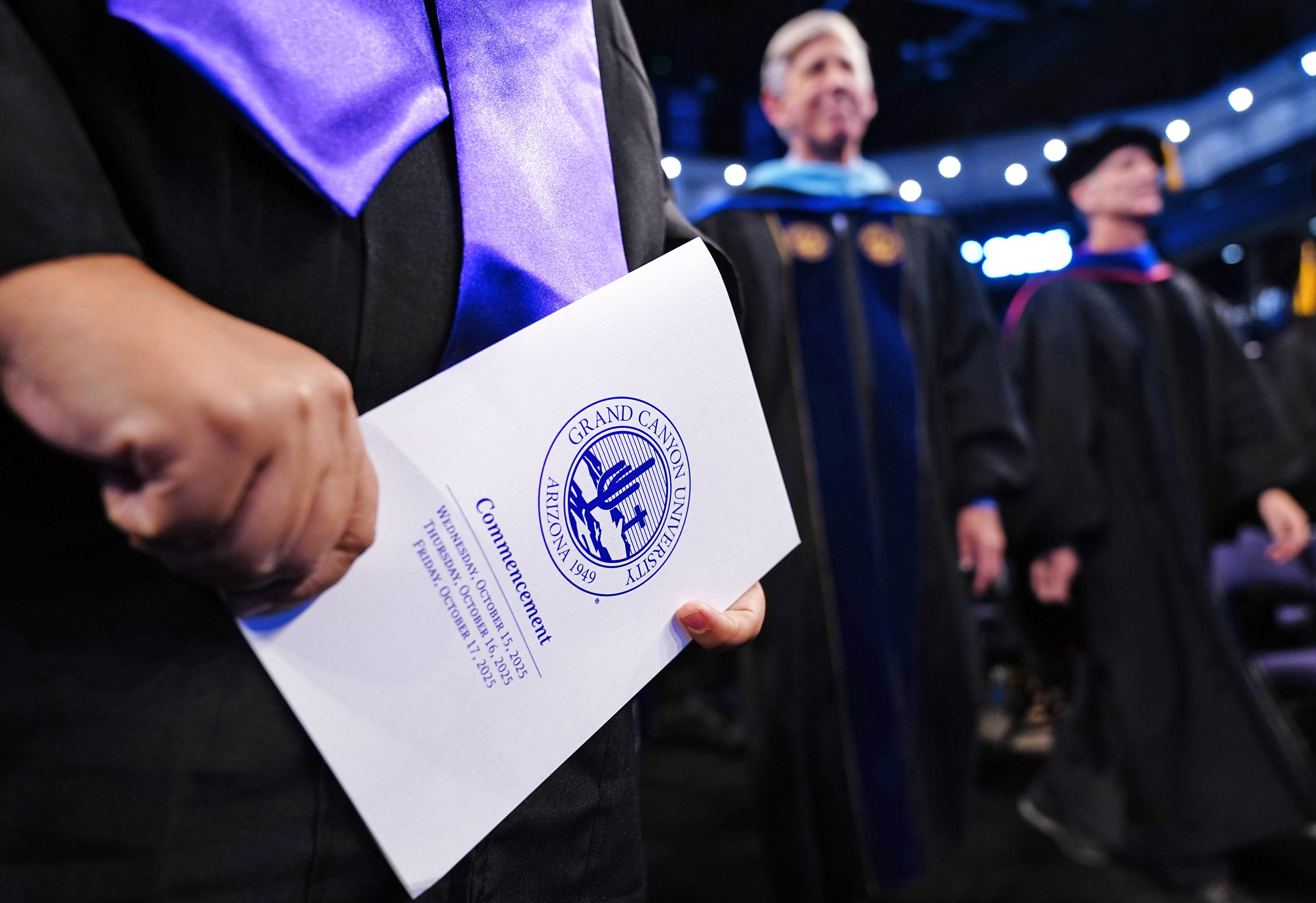 Graduates stand as the processional led by GCU President Brian Mueller and Provost Dr. Randy Gibb makes its way to the stage during the Wednesday afternoon fall commencement ceremony. -
