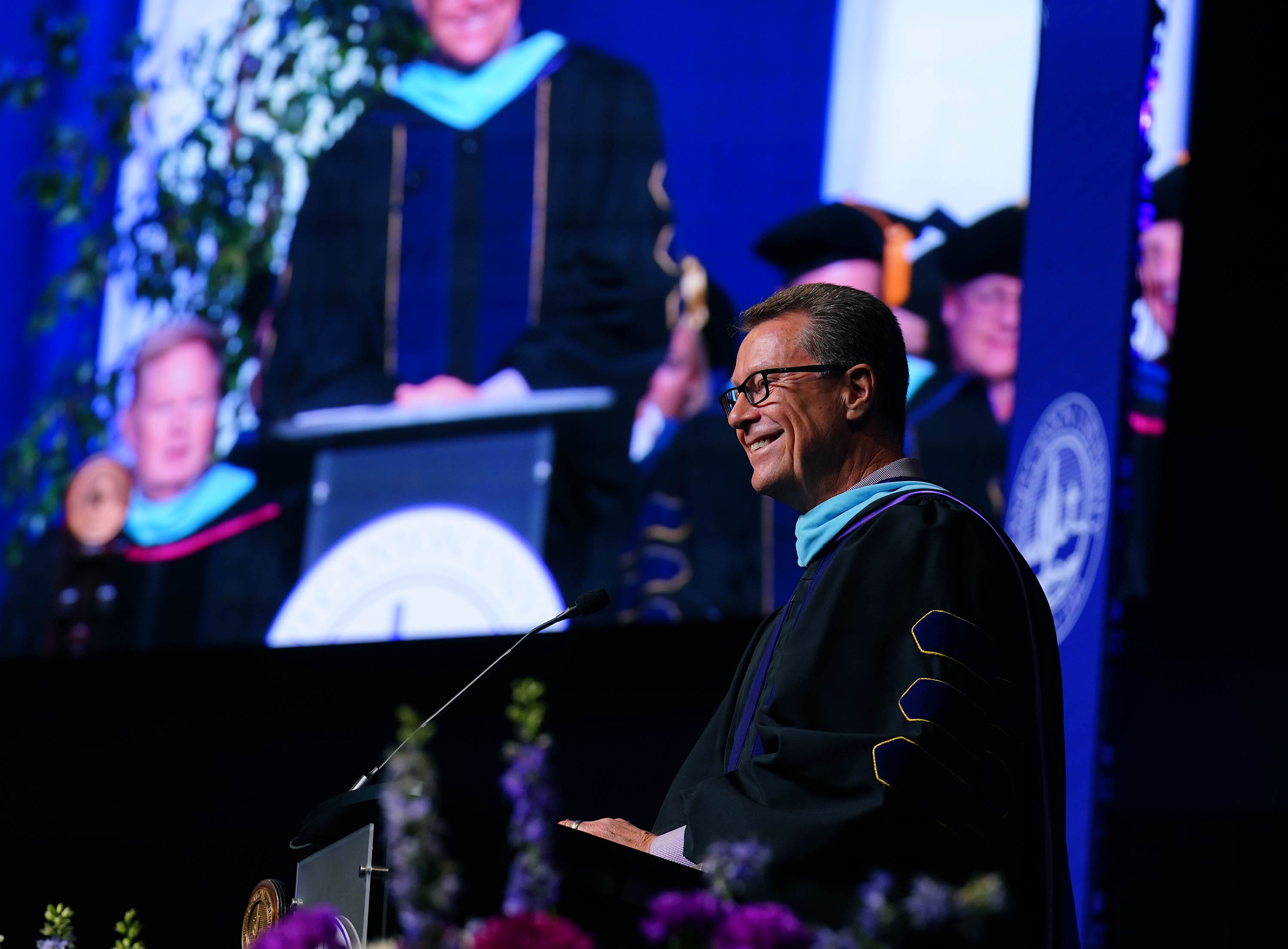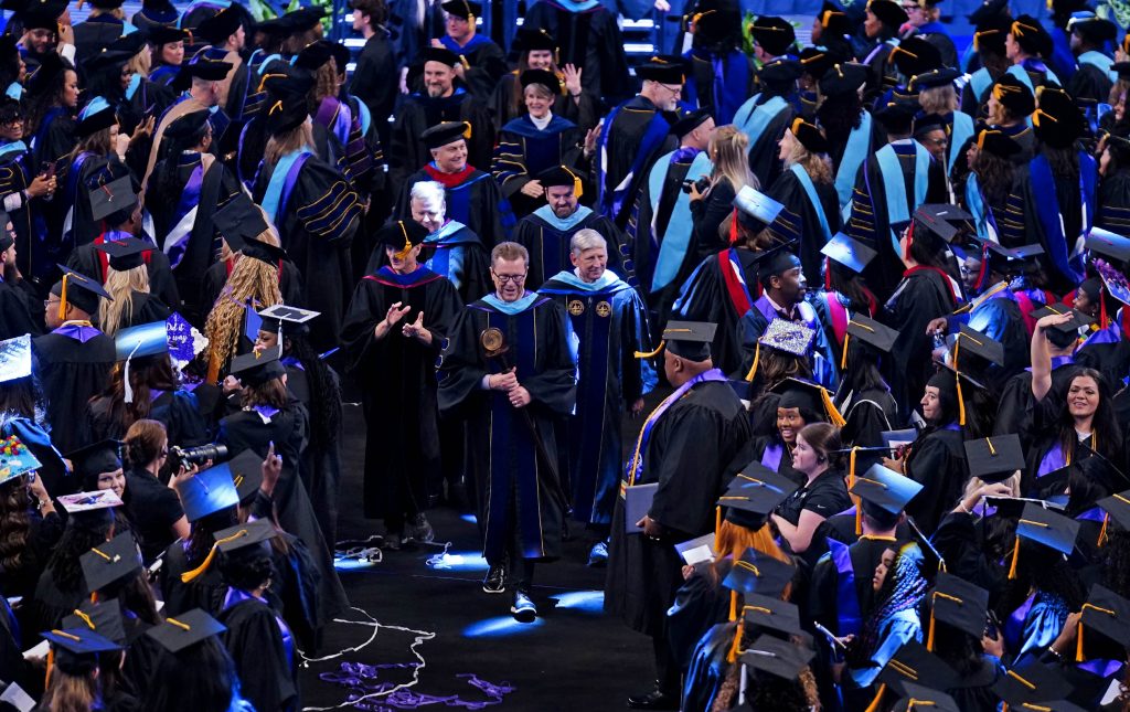 Dean of Students Dr. Tim Griffin greets graduates during the Wednesday afternoon commencement ceremony for online and cohort students at Global Credit Union Arena. -