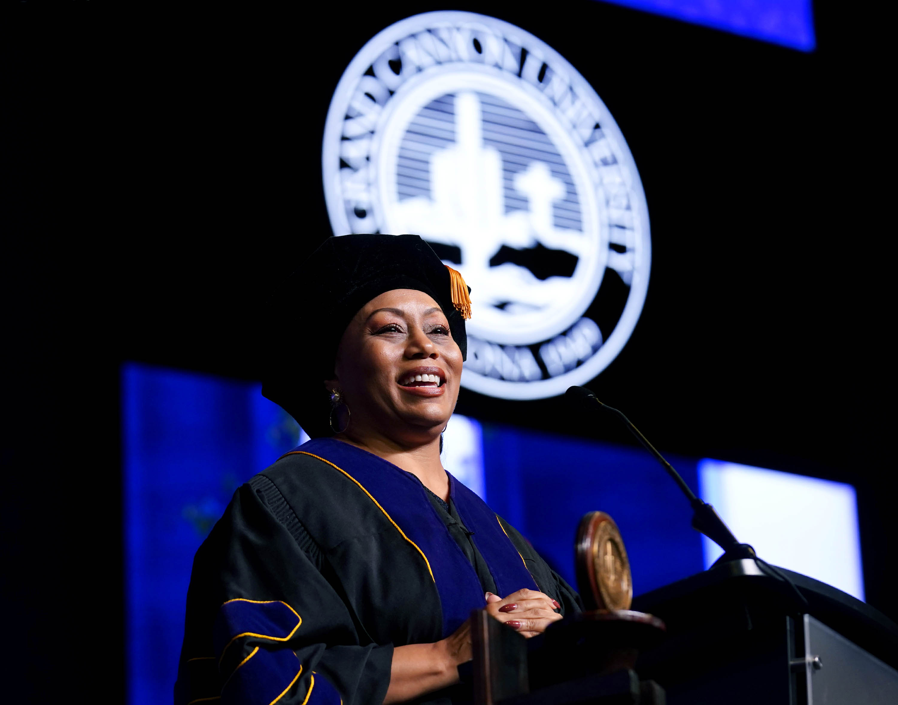 Student speaker Dr. Stac`e Middlebrooks addresses her fellow graduates during the Wednesday afternoon fall commencement ceremony at Global Credit Union Arena on Oct. 15, 2025. -