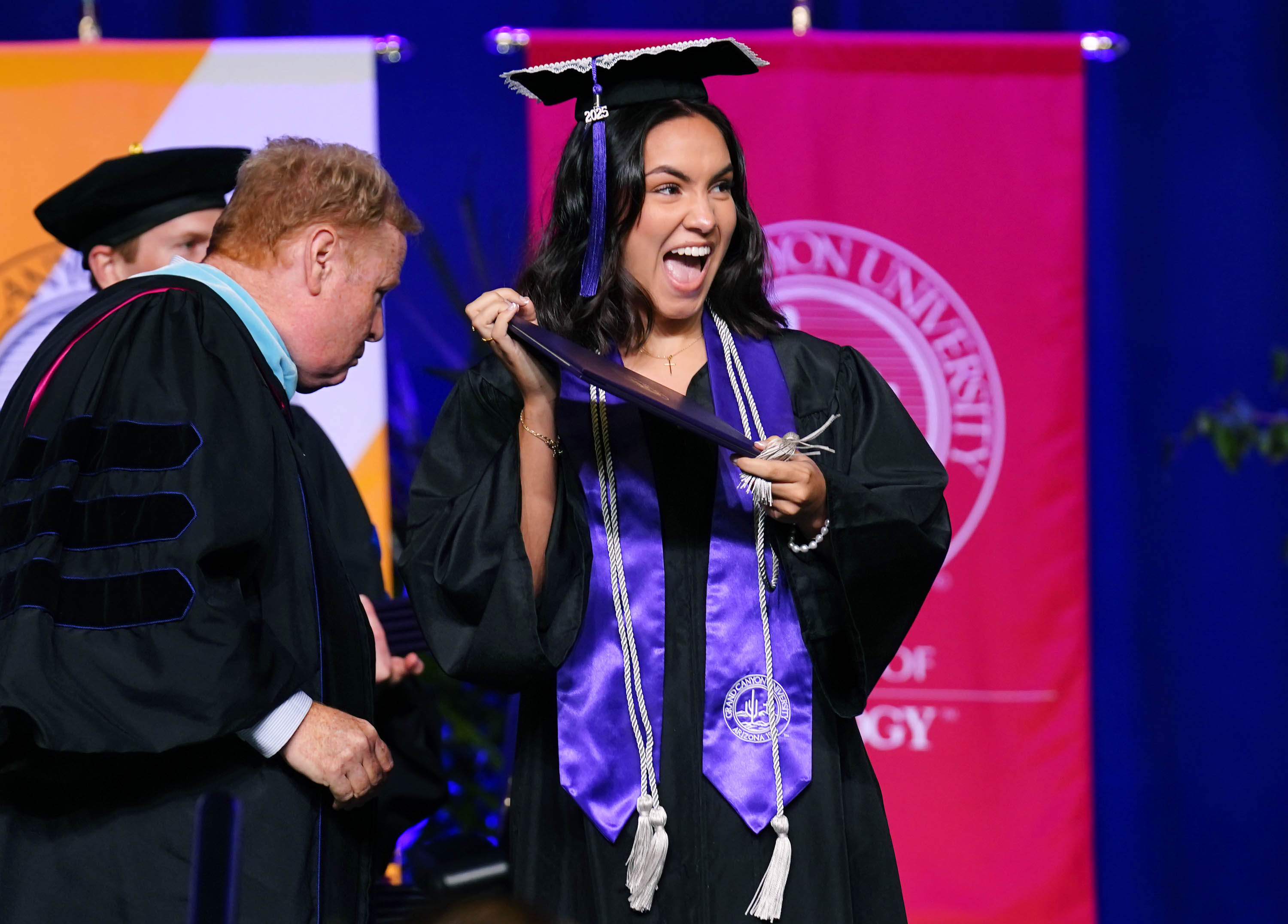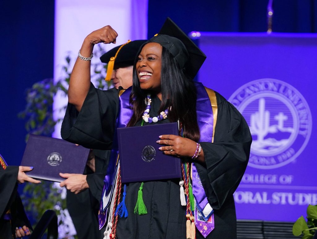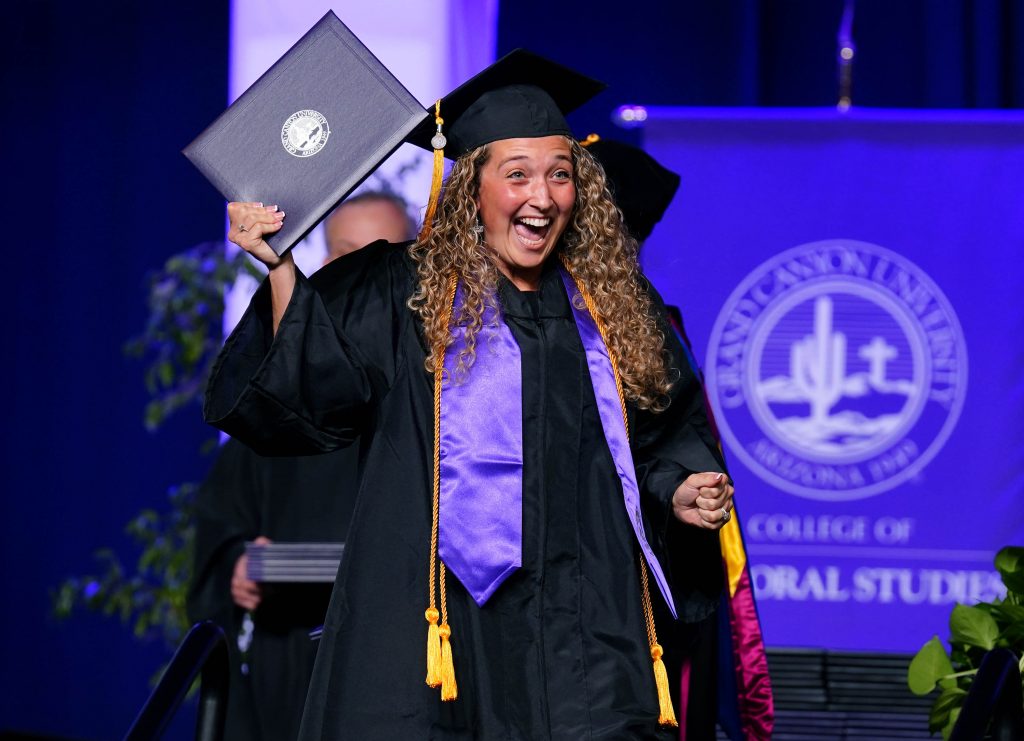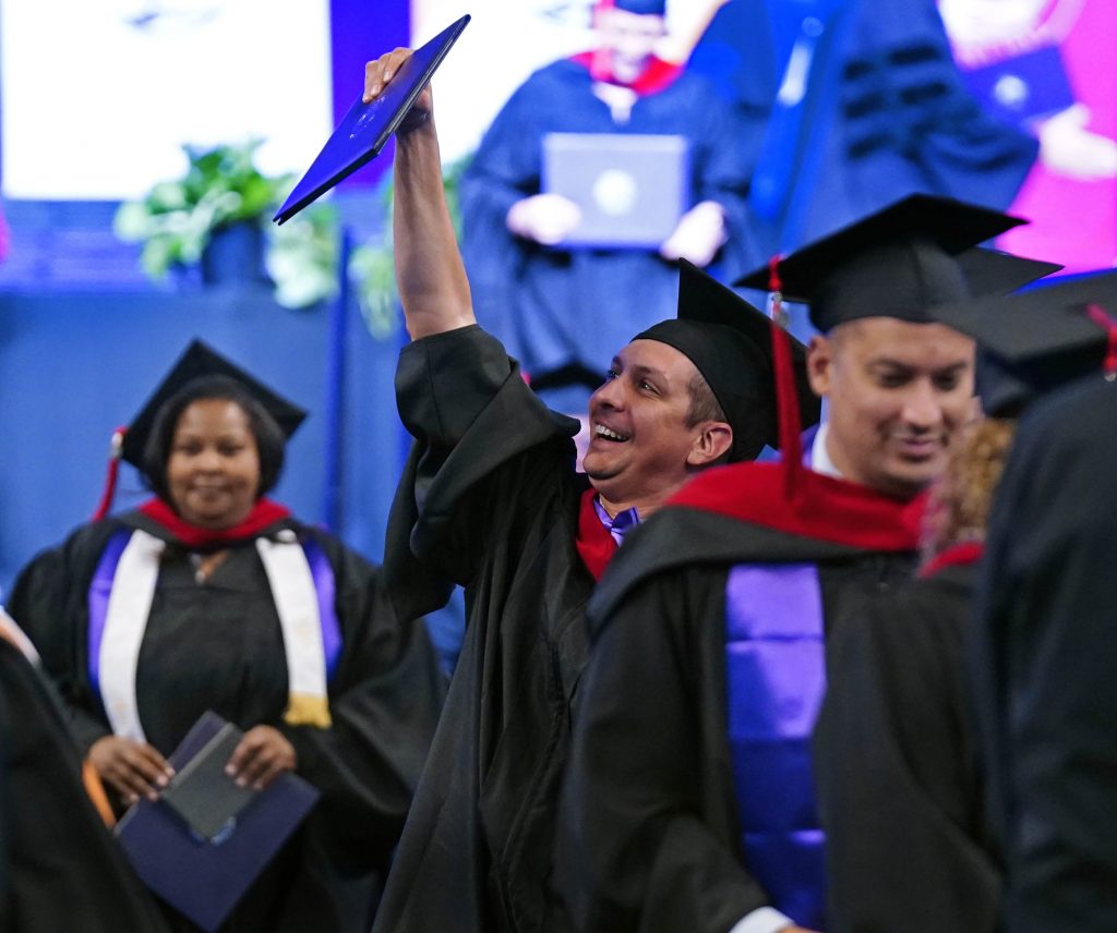Graduates celebrate after receiving their diploma during the Wednesday afternoon commencement ceremony for online and cohort students. -