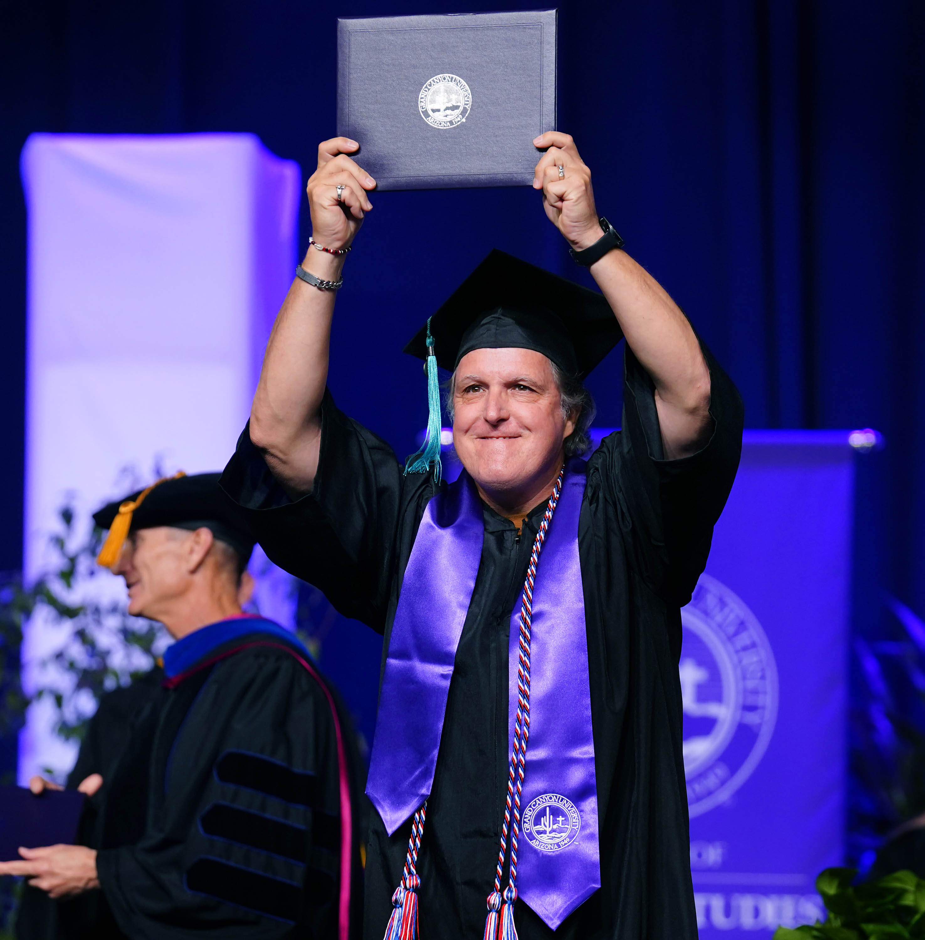 A graduate displays his diploma during the Wednesday afternoon commencement ceremony for online and cohort students. -