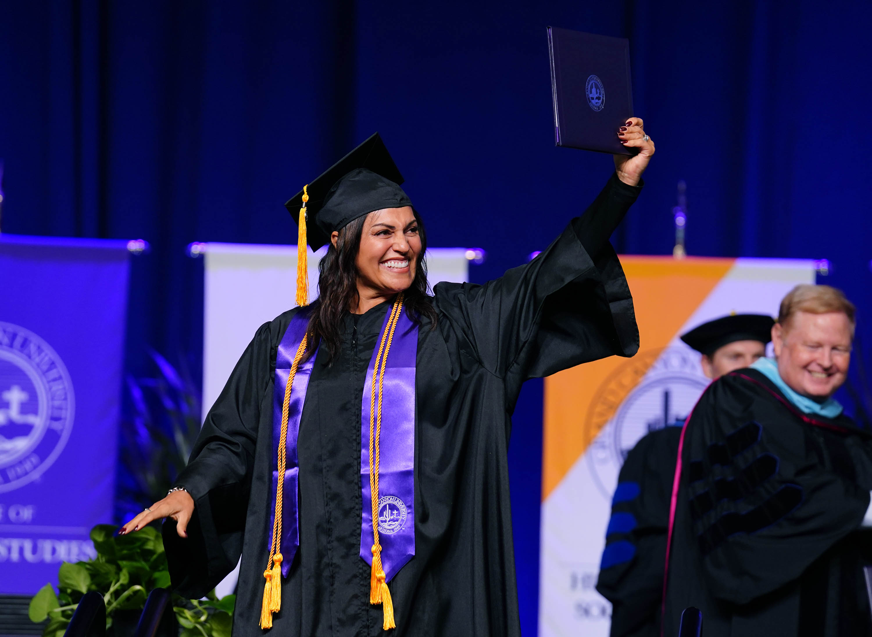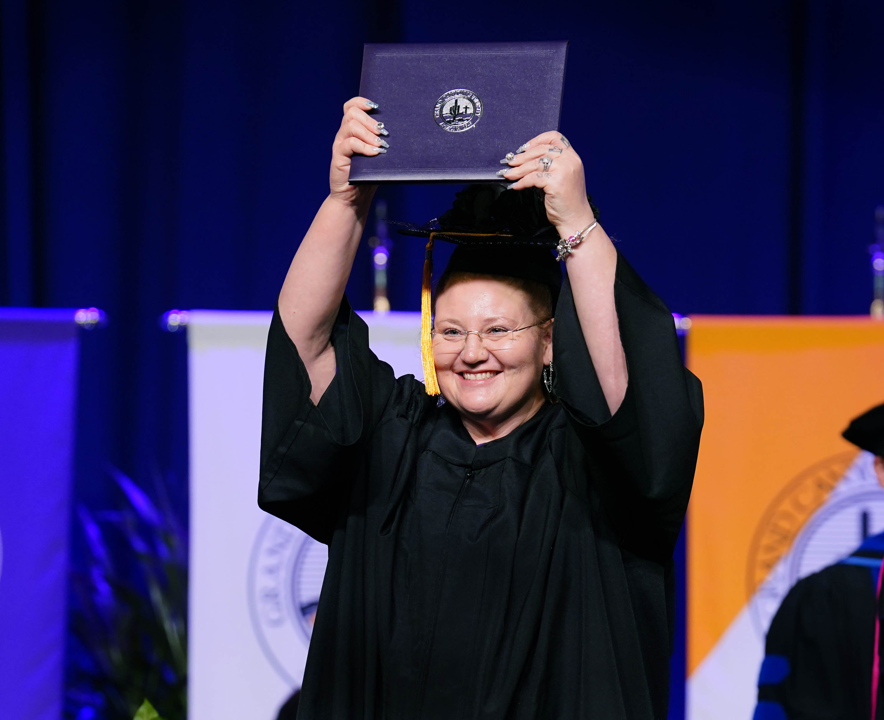 A graduate displays her diploma during the Wednesday afternoon commencement ceremony for online and cohort students. -