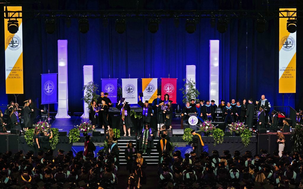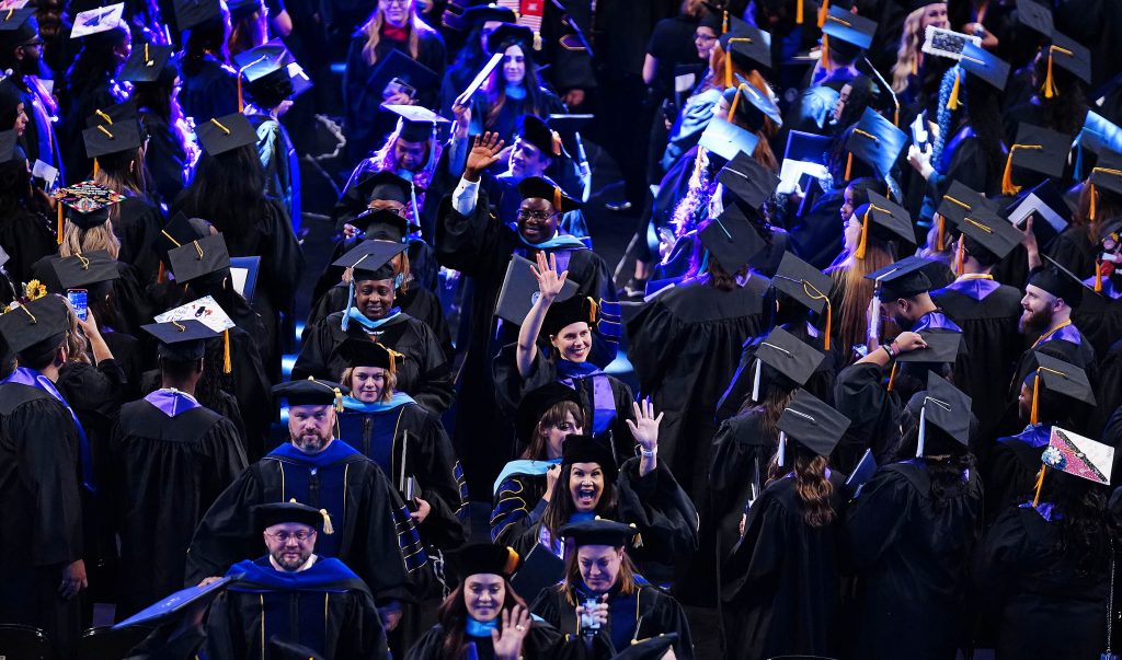 Graduates walk the stage during the Wednesday afternoon commencement ceremony for online and cohort students. -