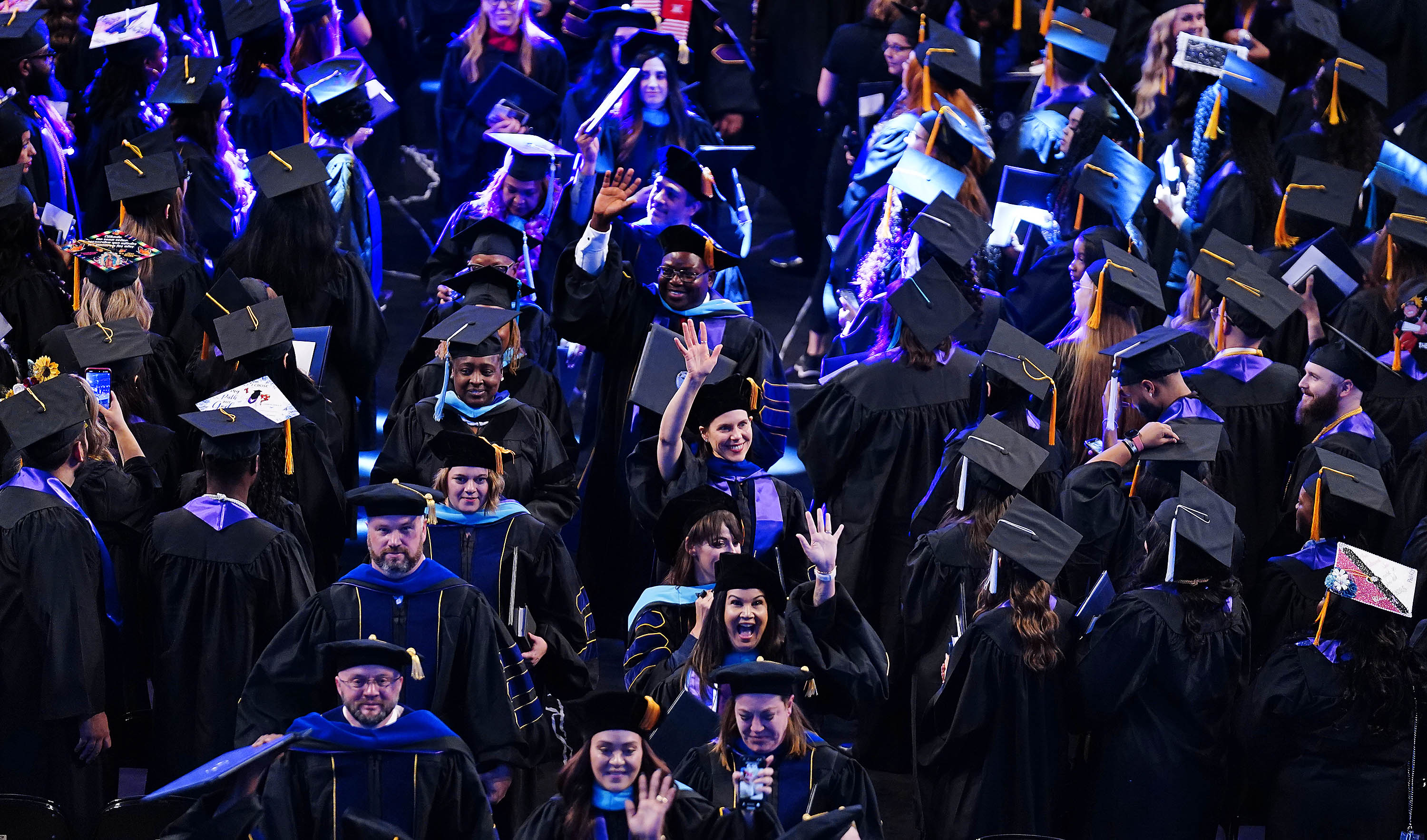 Graduates wave to friends and family as they exit the arena following the Wednesday afternoon fall commencement ceremony. -