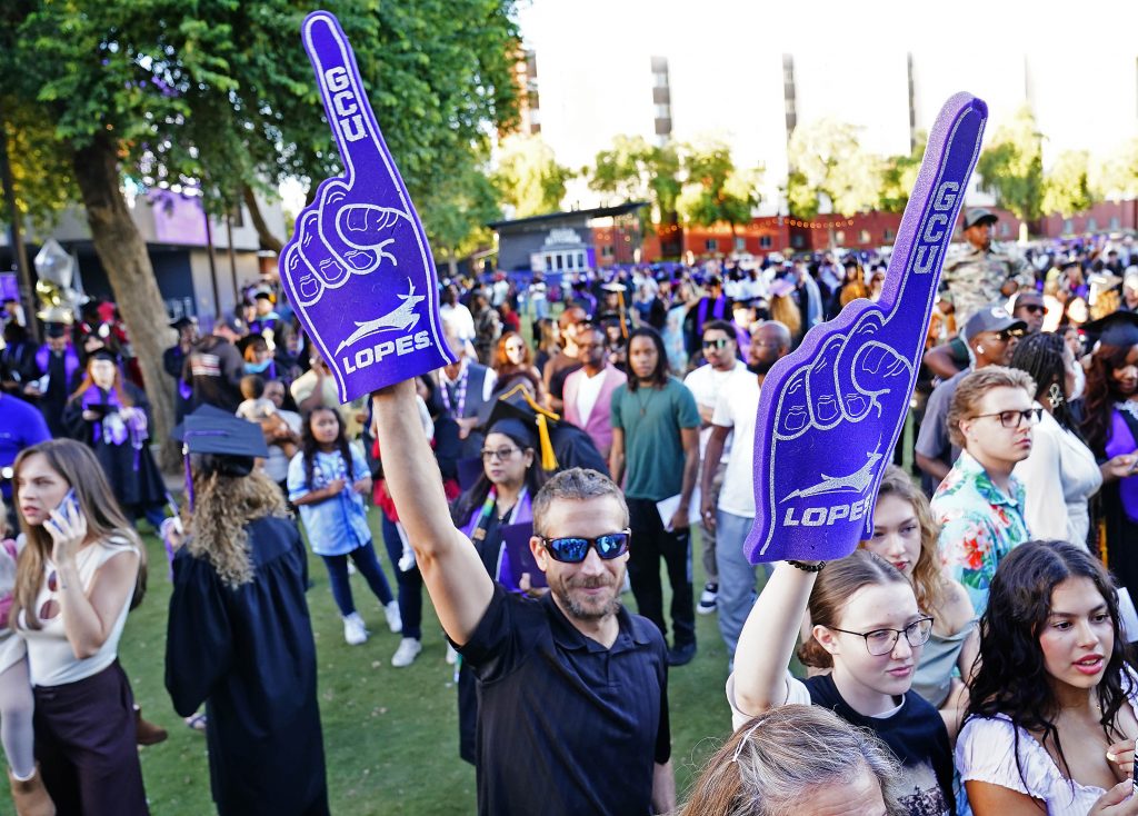 Family members hold up giant foam fingers to help their graduate find them on the Quad following the Wednesday afternoon fall commencement ceremony. -
