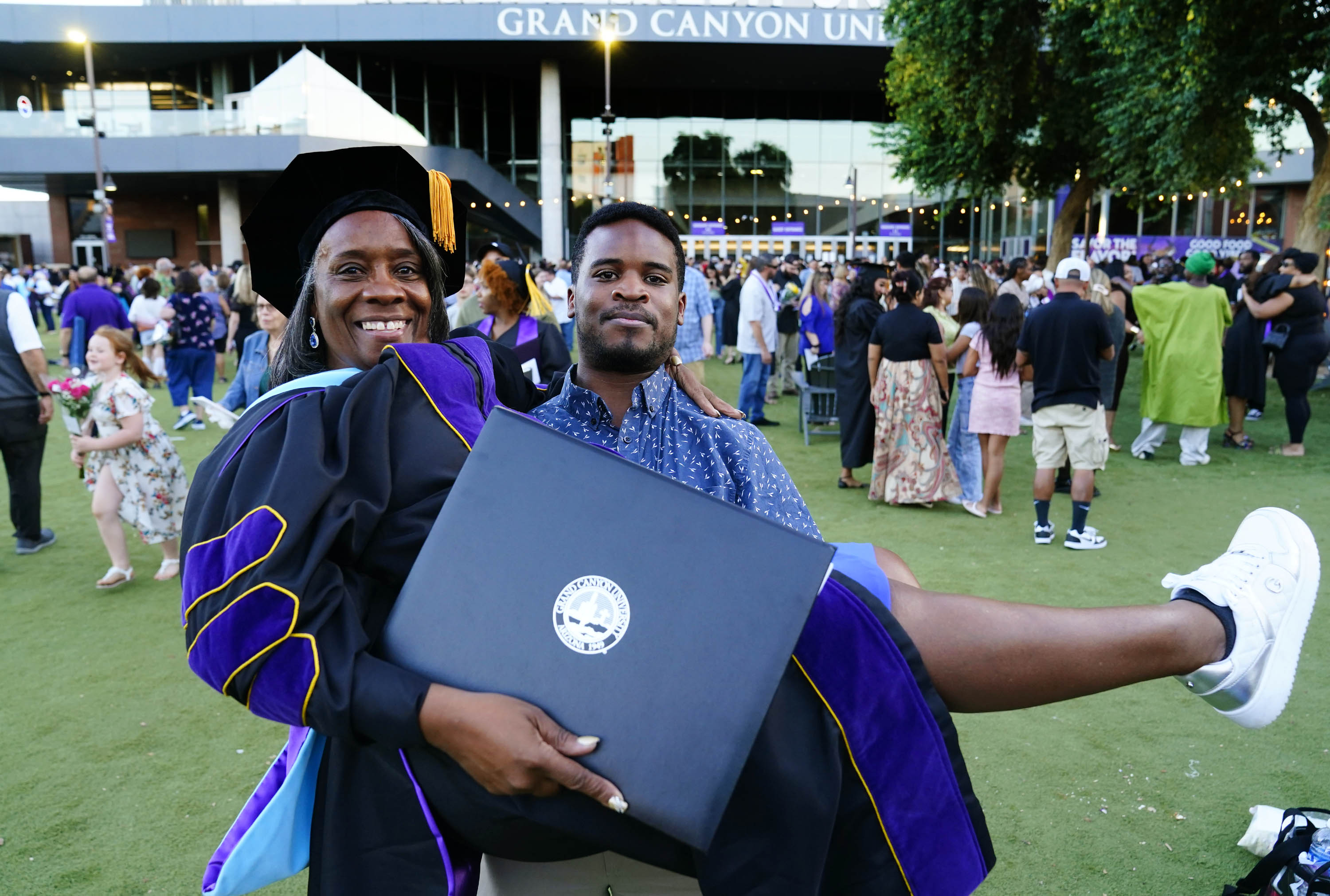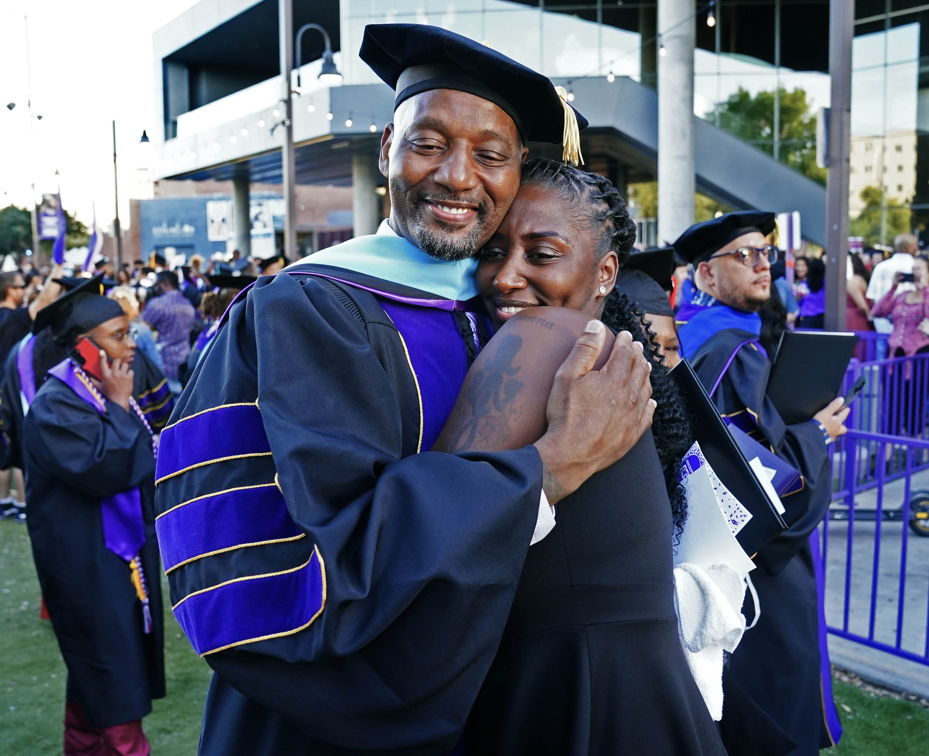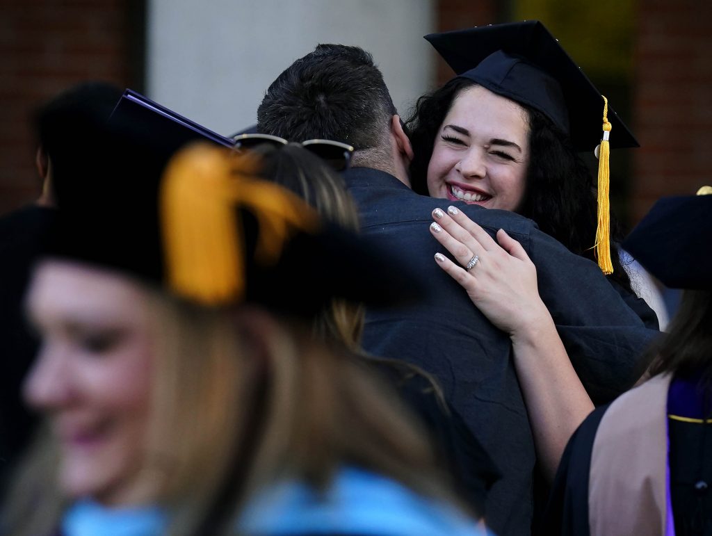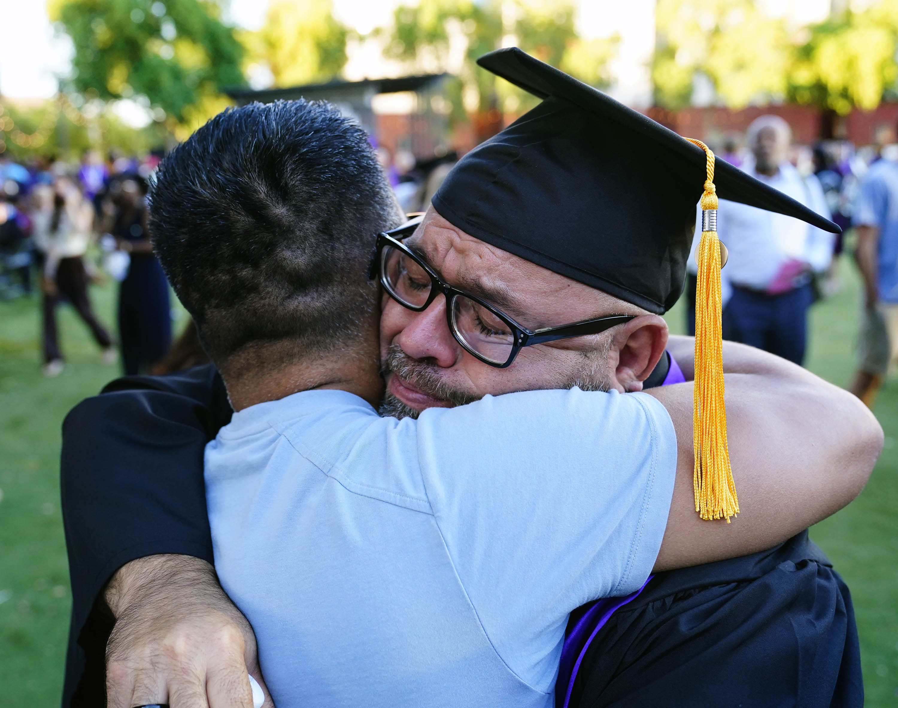 An emotional graduate hugs a family member following the Wednesday afternoon commencement ceremony for online and cohort students. -